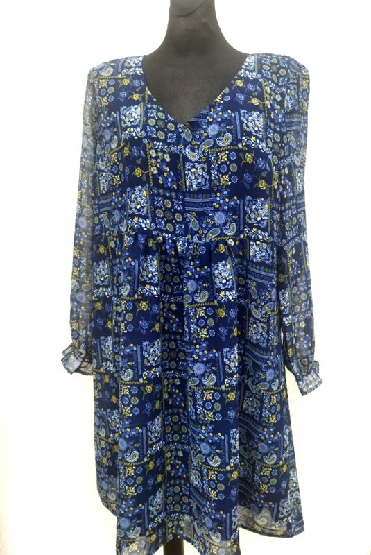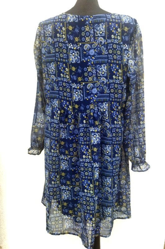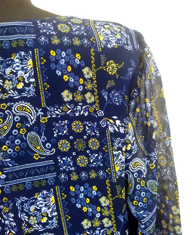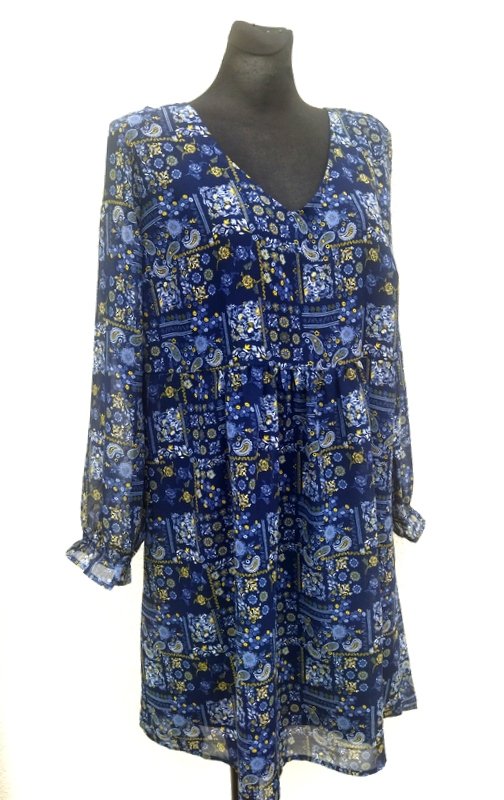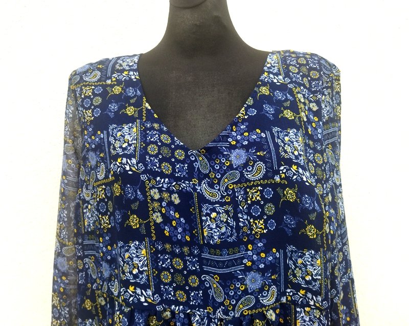 Wzorzysta sukienka z żorżety poliestrowej w granatowym kolorze z kwiatowymi wzorkami oraz paisley w niebieskim, białym i słomkowym kolorze. Odcinana w pasie , góra z dekoltem w szpic, rękawy dołem przeszyte gumką tworząc wąska falbankę, dół lekko marszczony. Na rozciągliwej granatowej podszewce.