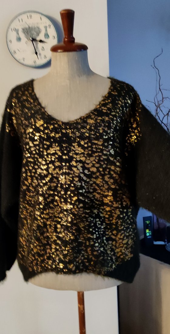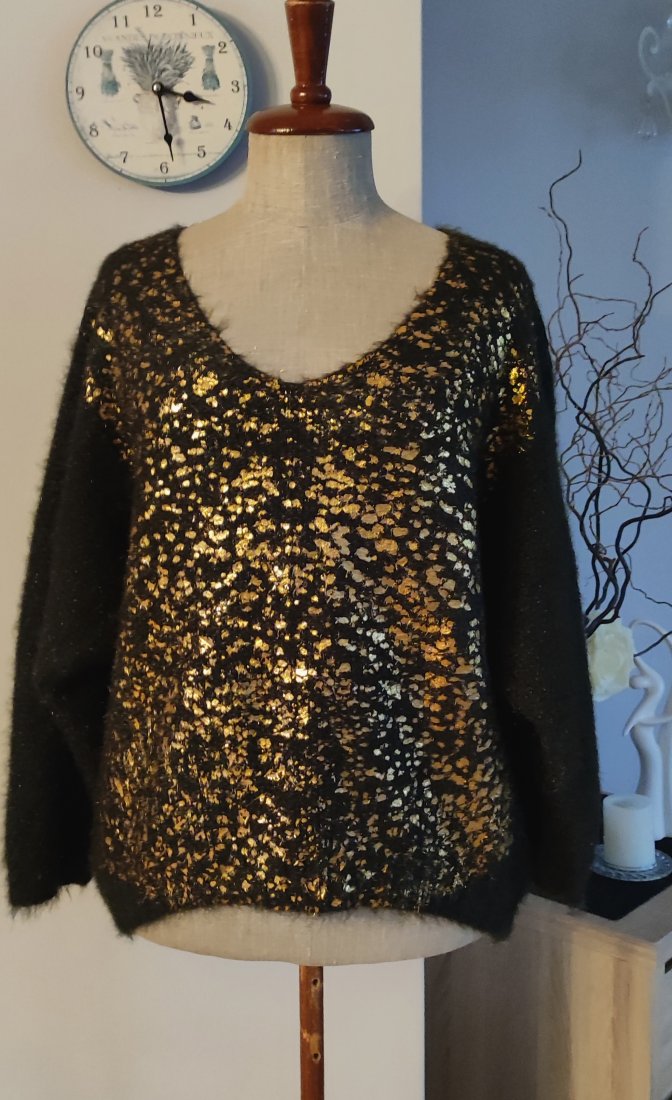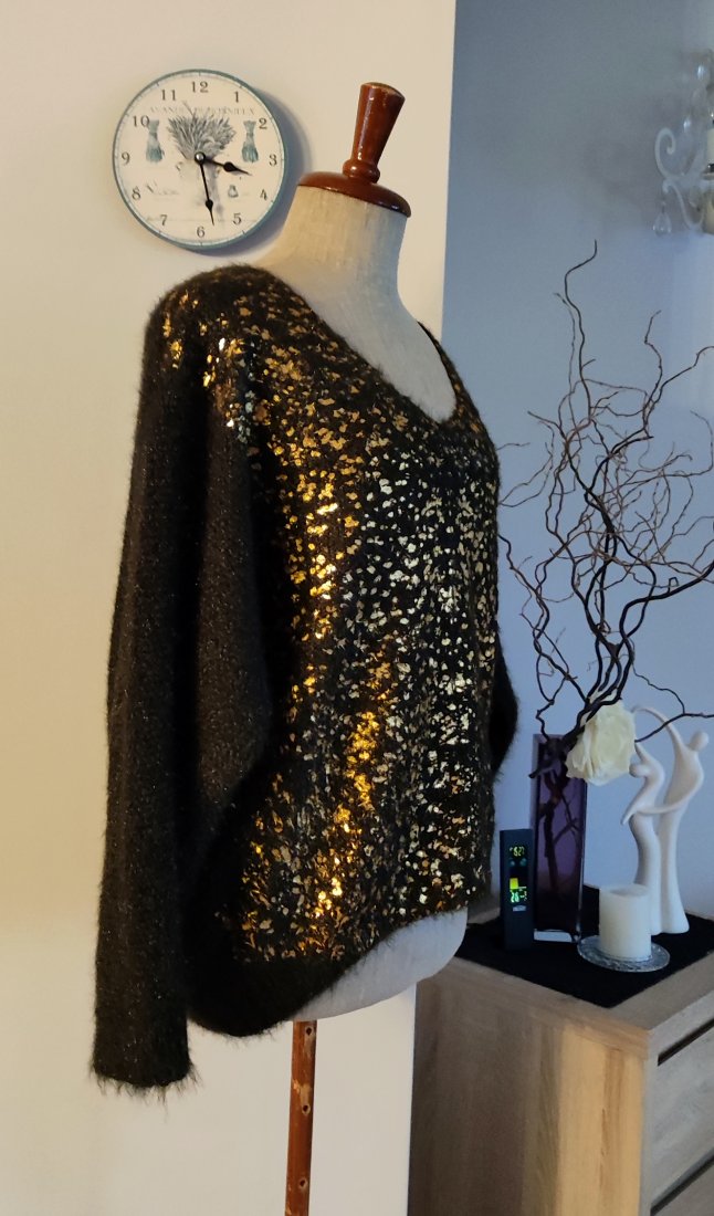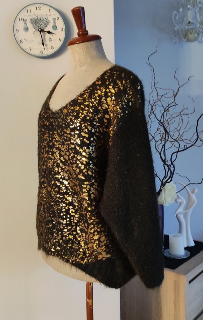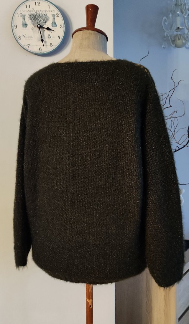 Miękki ,ciepły i zarazem elegancki kimonowy sweterek w kolorze ciemnej zieleni z nakrapianym złotem na przodzie i dłuższym tyłem. Nowy, ale bez metki.