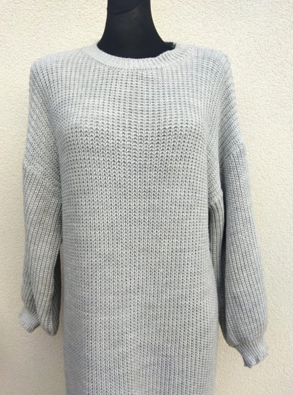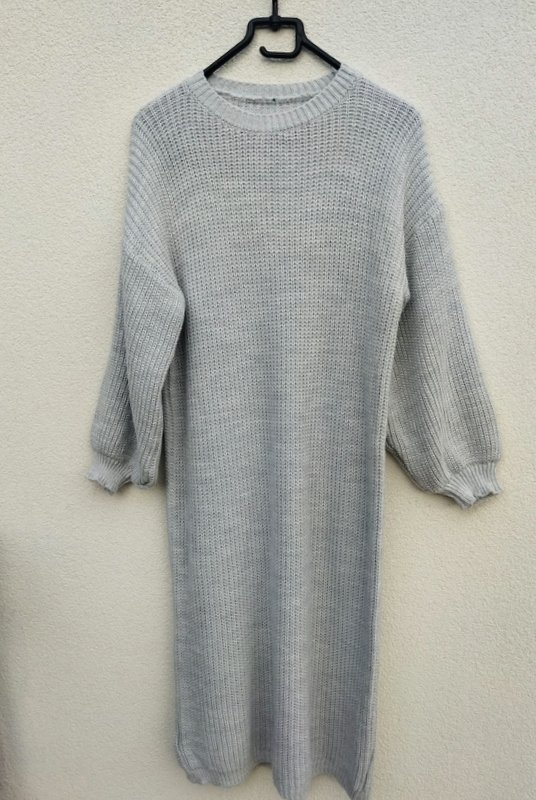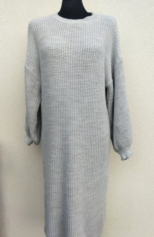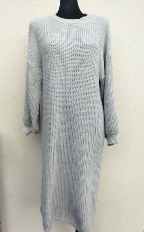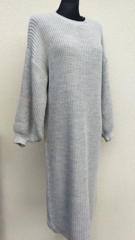 Dzianinowa luźna  sukienka  z akrylowej włóczki  w melanżowym jasnoszarym kolorze z obniżoną linią ramion Wykończona ściągaczami.