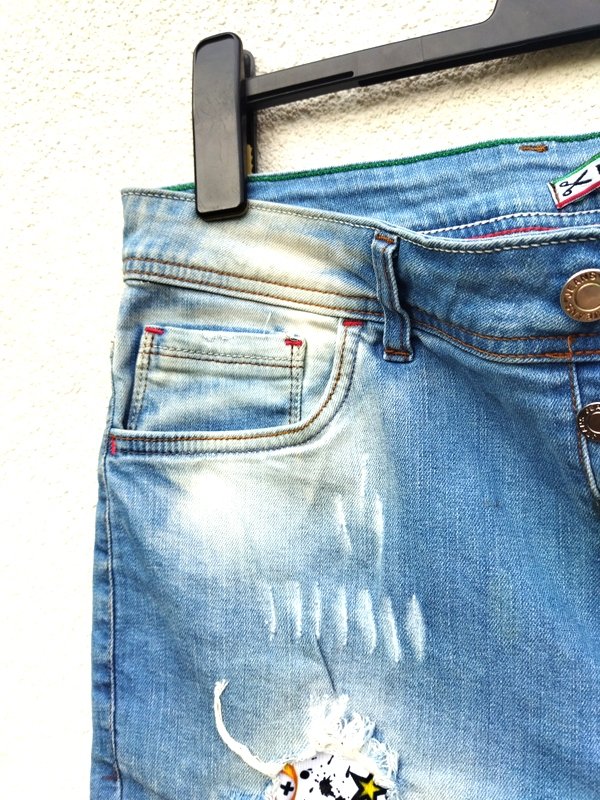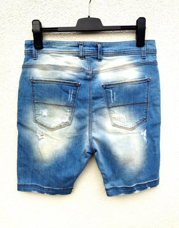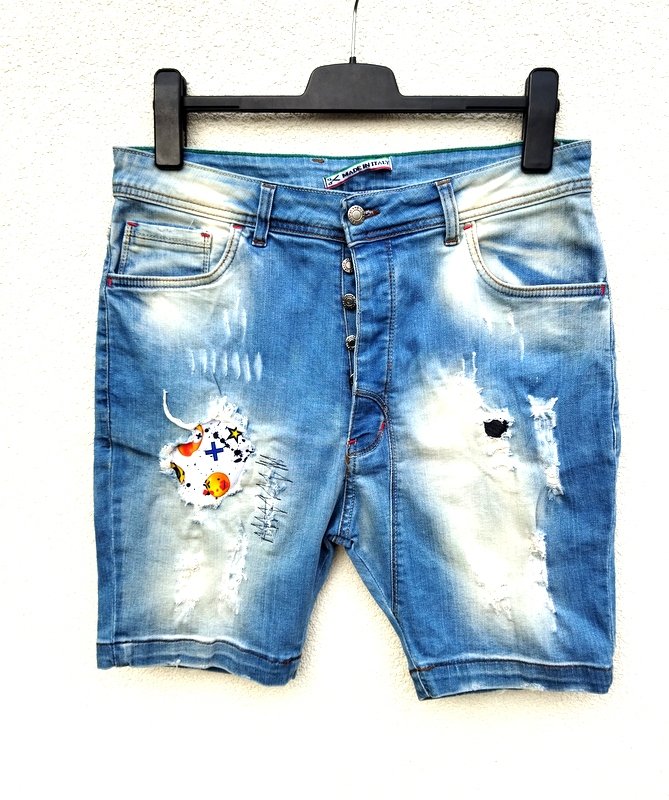 Krótkie spodnie z przecieranej jeansowej tkaniny w niebieskim kolorze, z celowymi przetarciami i ,, dziurami", niektóre podszywane wzorzystą tkaniną. Z 5-cioma klasycznymi kieszeniami, z karczkiem z tyłu. zapinane z przodu na metalowe guziki ukryte pod plisa - jeden na zewnątrz. Podatne i rozciągliwe.