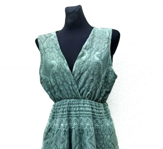 Sukienka z koronkowej tkaniny wiskozowo- bawełnianej w zielonym kolorze. odcinana w pasie góra zakładana kopertowo, w talii wszyta gumka, dół marszczony rozkloszowany. Na przewiewnej cienkiej podszewce w kolorze koronki