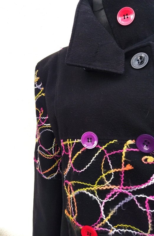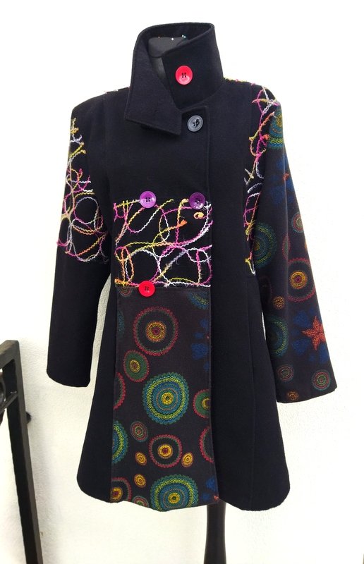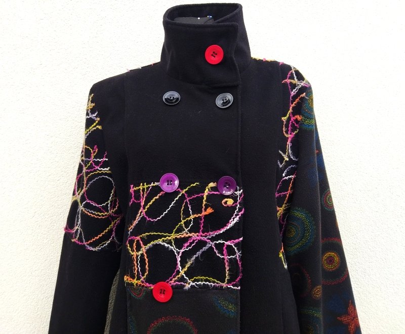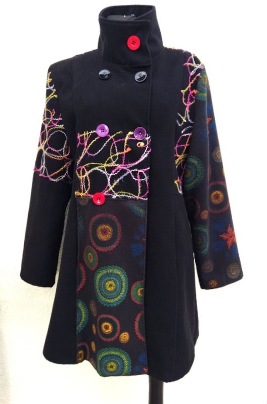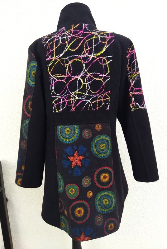 Designerski płaszcz z flauszowej poliestrowo-wełnianej tkaniny w czarnym kolorze w różnorakie haftowane kolorową włóczką oraz malowane mandalowe. Wyższy kołnierz typu stójka , dwie wpuszczane kieszenie Dwurzędowy, zapinany w guziki w kolorach włóczki i mandalowych wzorów guziki kompletne - jeden czerwony na zdjęciu nie zapięty).Całość na podszewce.