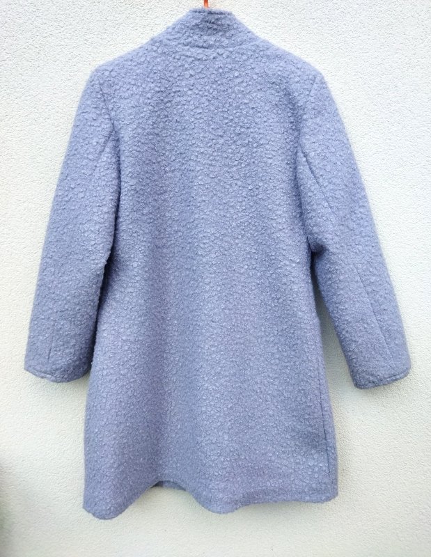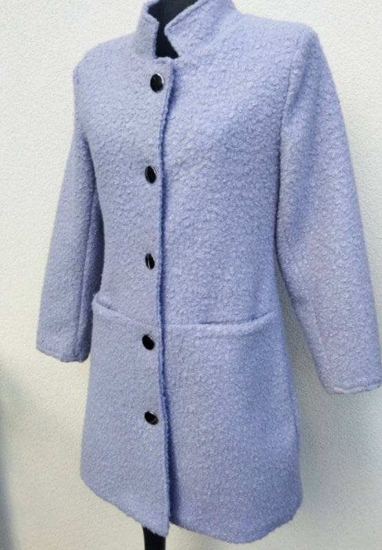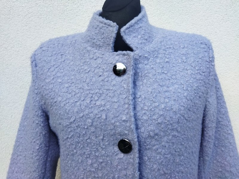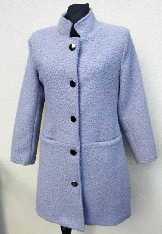 Przejściowy płaszcz z poliestrowej tkaniny z fakturą boucle w jasnoniebieskim kolorze ( gołębi odcień). Z kołnierzem stójka , z dwiema wpuszczanymi kieszeniami. zapinany na metalowe guziki w srebrnym kolorze. Całość na podszewce.