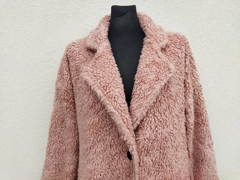 Nieocieplany płaszcz ze sztucznego futerka w kolorze dymnego różu . Z kołnierzem z rewersami, z dwiema wpuszczanymi kieszeniami w szwach bocznych, zapinany na jeden guzik. Na podszewce.