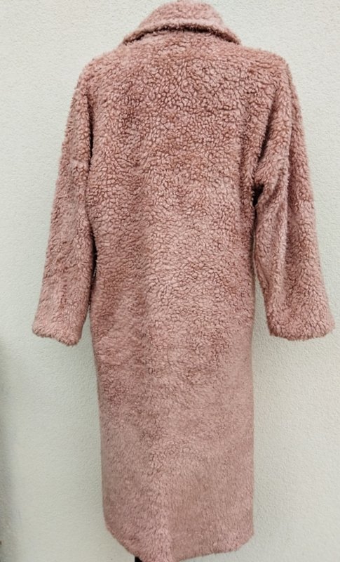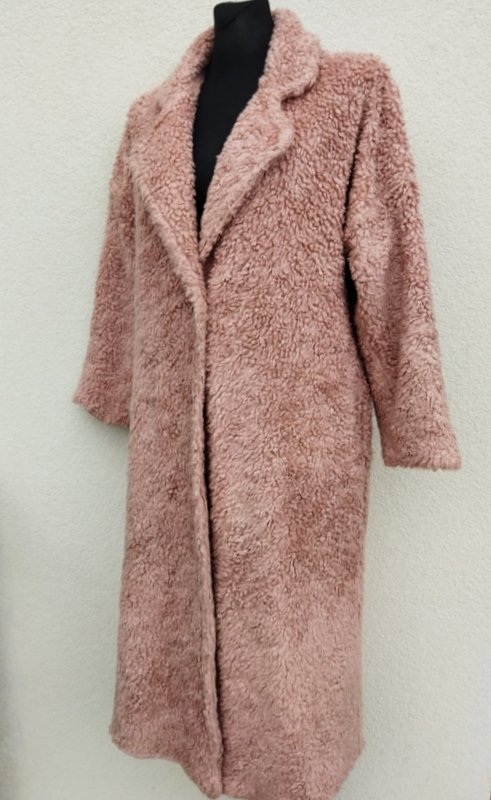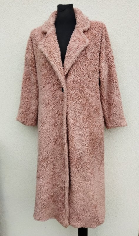 Nieocieplany płaszcz ze sztucznego futerka w kolorze dymnego różu . Z kołnierzem z rewersami, z dwiema wpuszczanymi kieszeniami w szwach bocznych, zapinany na jeden guzik. Na podszewce.
