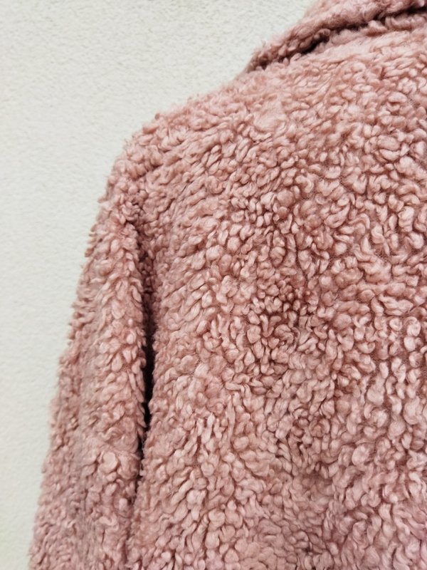 Nieocieplany płaszcz ze sztucznego futerka w kolorze dymnego różu . Z kołnierzem z rewersami, z dwiema wpuszczanymi kieszeniami w szwach bocznych, zapinany na jeden guzik. Na podszewce.
