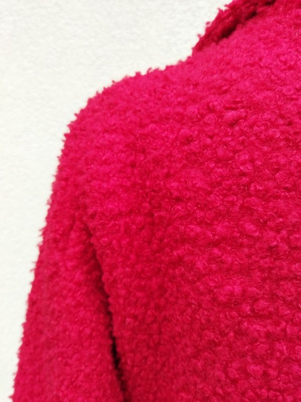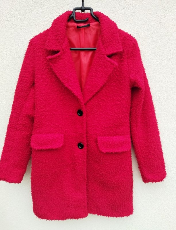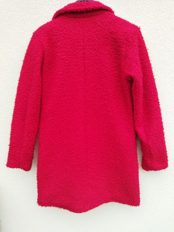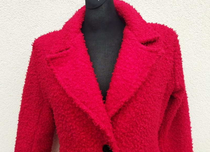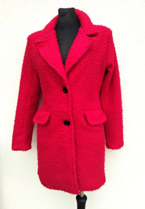 Płaszcz lub dłuższa kurtka z poliestrowej tkaniny z faktura boucle w kolorze nasyconej czerwieni, Z kołnierzem z rewersami , z dwiema wpuszczanymi kieszeniami z patkami. Zapinana na dwa guziki. Całość na podszewce