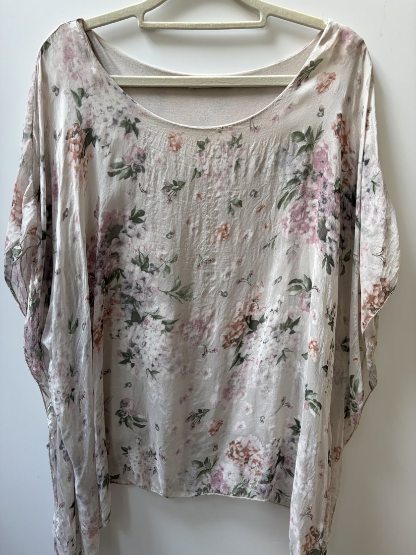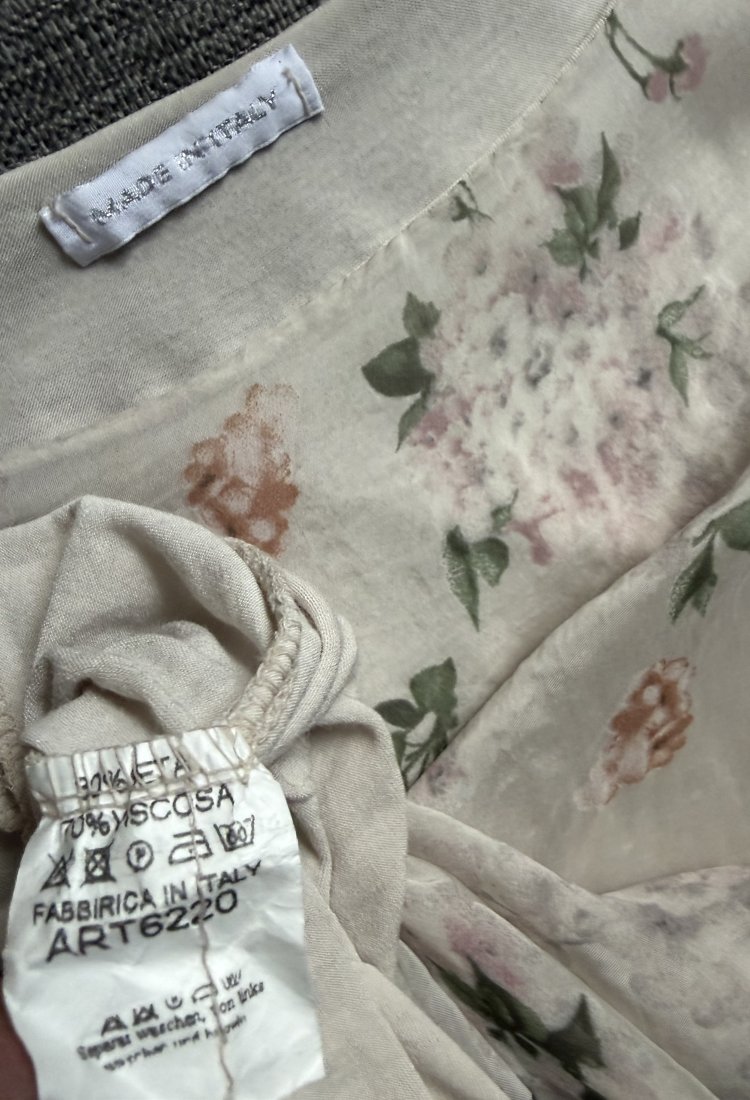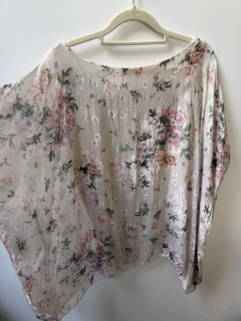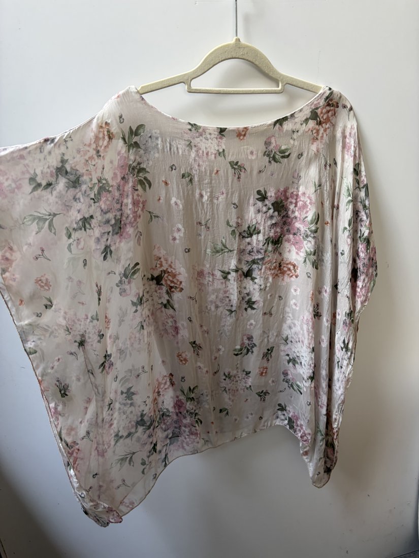 MADE IN ITALY . Bluzka nietoperz zwiewna mgiełka 30 % seta 70 % viskoza . Dwuwarstwowa - Spód jest rozciągliwy i przyjemny w dotyku, dobry gatunek .Wzór kwiatowy , romantyczny , delikatny w subtelnych barwach . dekolt bez rozciągania 32 długość rękawa od dekoltu 31 ( rękawa w sensie stricto brak - zszyte boki . pachy czyli od zszycia do zszycia 69 cm dol 86 długość całkowita około 62 cm . Stan zachowania bardzo dobry -drobne ślady użytkowania. Wymiary podane mierzone na płasko .