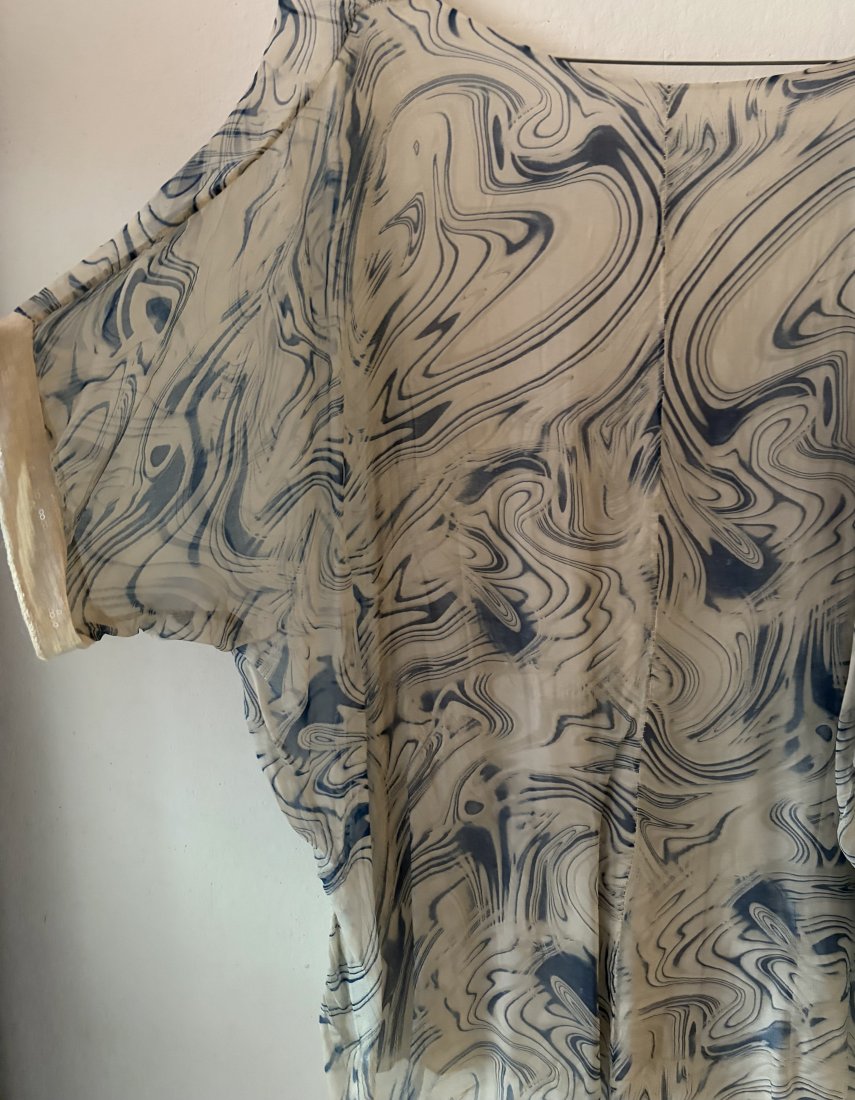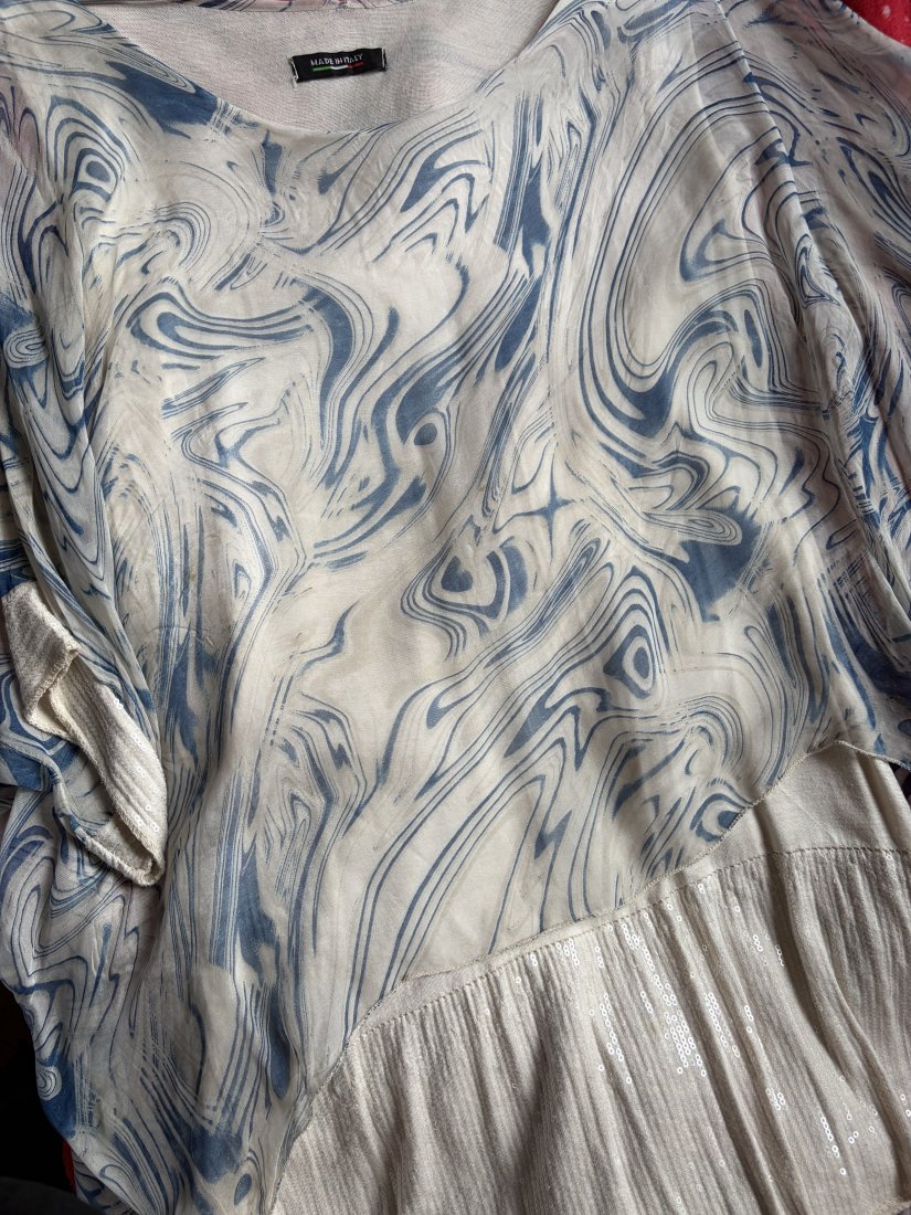 Dwuwarstwowa oryginalna , zwiewna luźna bluzka - nietoperz .Oryginalna , zwiewna . Metka - MADE IN ITALY . 45 % Silk 55 % viskose.( mgiełka warstwa wierzchnia )Rozciągliwy spód 95 % viskose 5 % elastan . Eleganckie subtelne cekinowe wykończenie dołu i rękawów . Drapieżny wzór w niuansach niebieskości na bardzo jasno beżowym tle . Szerokość dekoltu 30 długość rękawa od dekoltu 38 cekinowe. obszycie rękawa prawie 4 szerokość rękawa na dole 17 cm pachy 68 długość od ramienia przód warstwy wierzchniej około 55 całkowita około 75 cm dół około 75 cm Stan zachowania bardzo dobry , minimalne ślady użytkowania . Metki : firmowa i ze składem obecne .Wymiary podane mierzone na płasko . Uwaga !!!.