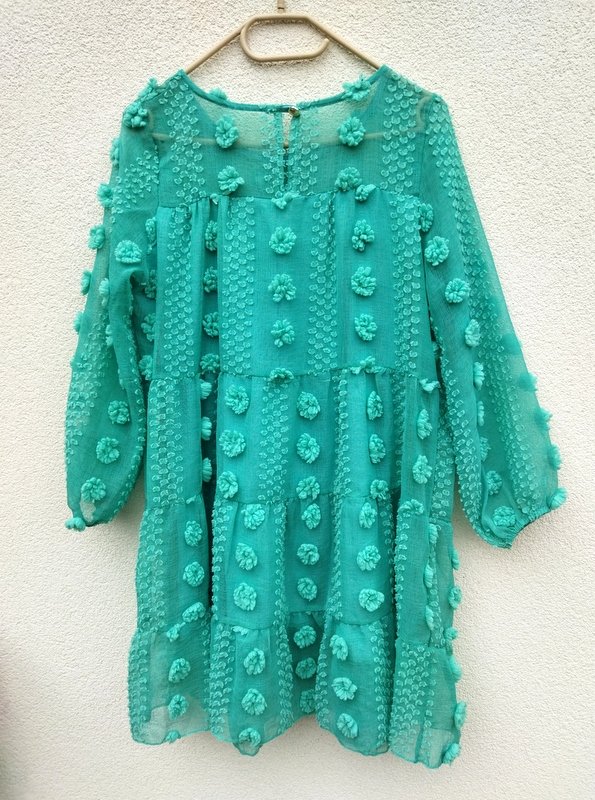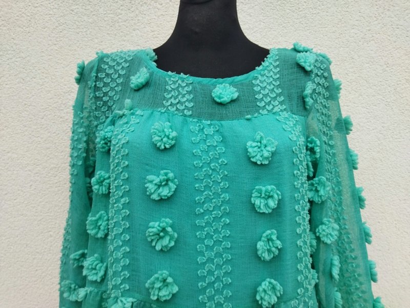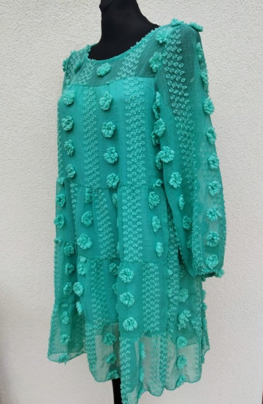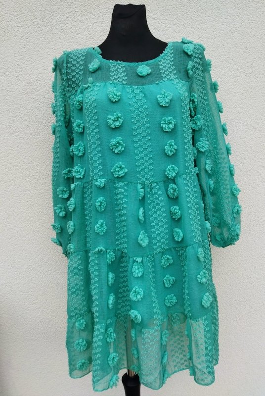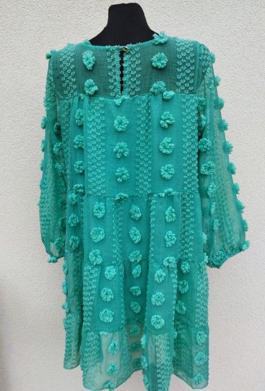 Zwiewna sukienka z cienkiej lekko transparentnej tkaniny z fakturą plumeti i przestrzennymi kwiatuszkami w jasnozielonym kolorze. Z karczkiem, z trzema doszywanymi falbanami, , rękawy dołem zebrane gumką, Zapinana na plecach na mały guziczek. Na cienkiej rozciągliwej dzianinowej podszewce od linii karcza w dół.