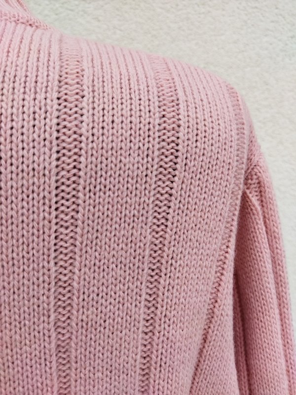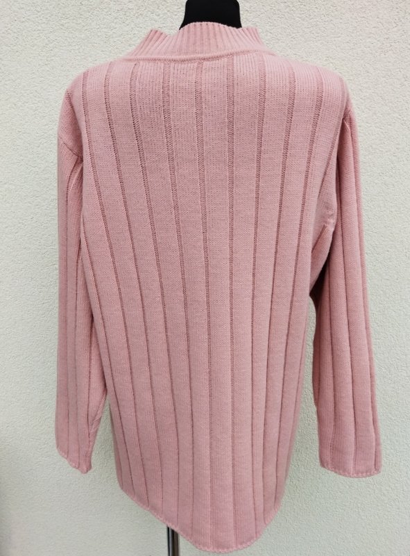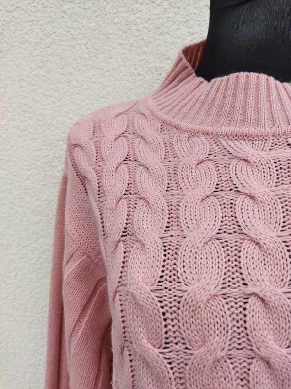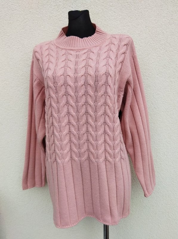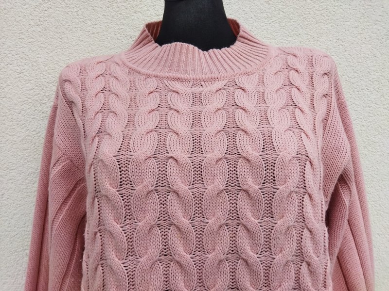 Dobrej jakości sweter z wełniano -akrylowej włóczki w kolorze weneckiego różu, z warkoczowym wzorem z przodu.
