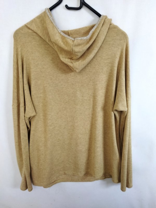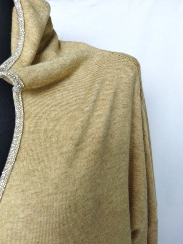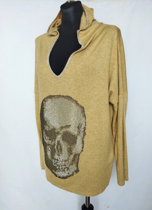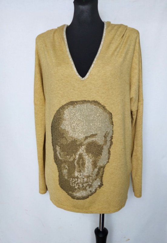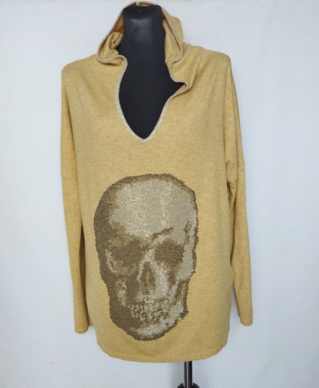 Świetnej jakości cienki sweterek lub dzianinowa bluza w rozbielonym musztardowym kolorze z trupią czaszka z mikroskopijnych dżetów w czarno srebrnej kolorystyce. Z kapturem i dekoltem w serek obszytymi srebrno-złocistą lamówką, z dwiema wpuszczanymi kieszeniami w szwach bocznych. Miła, podatna i rozciągliwa. Ładniejsza w realu.