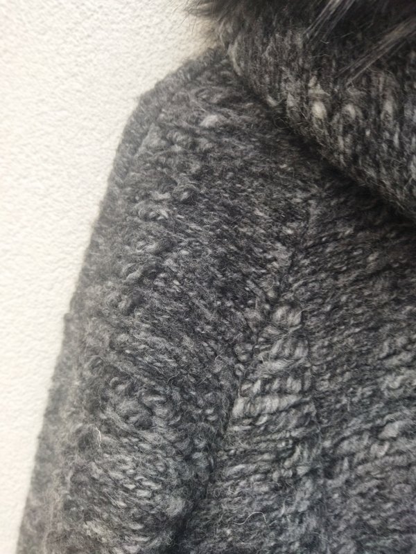 Wspaniała, ciepła kurtka z grubej wełnianej tkaniny dzianinowej o nieregularnym splocie w melanżowym szarym kolorze z domieszką poliestru, obszyta sztucznym futerkiem z długim włosem. Z kapturem , z raglanowymi rękawami, z dwiema wpuszczanymi kieszeniami, rozkloszowana dołem . Zapinana na dwa guziki. Całość na podszewce. Efektowna i bardzo lekka.