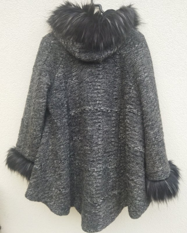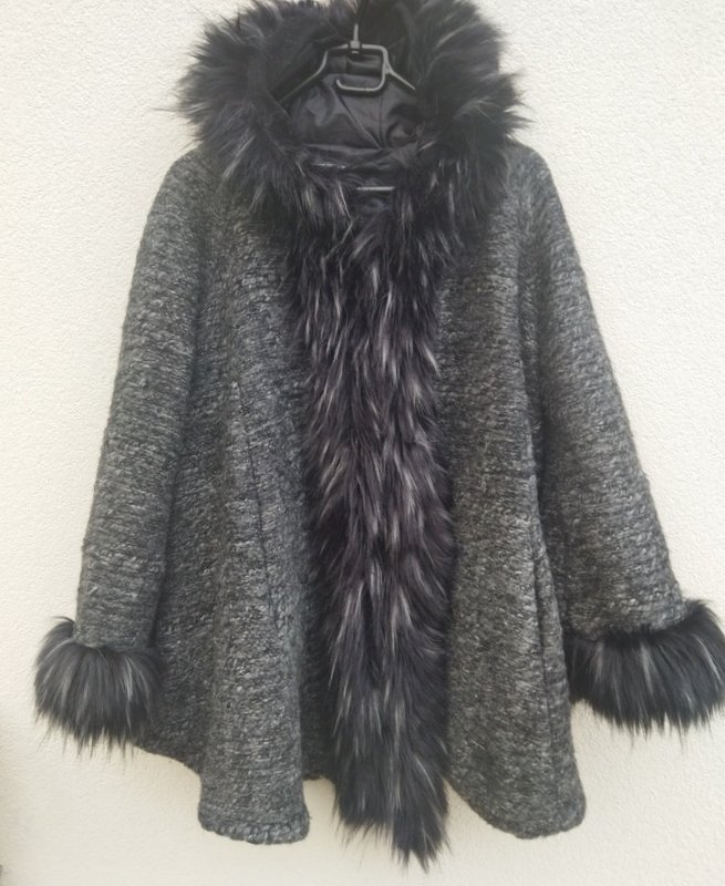 Wspaniała, ciepła kurtka z grubej wełnianej tkaniny dzianinowej o nieregularnym splocie w melanżowym szarym kolorze z domieszką poliestru, obszyta sztucznym futerkiem z długim włosem. Z kapturem , z raglanowymi rękawami, z dwiema wpuszczanymi kieszeniami, rozkloszowana dołem . Zapinana na dwa guziki. Całość na podszewce. Efektowna i bardzo lekka.