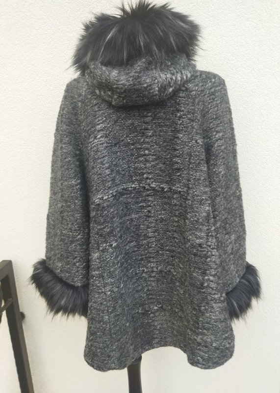 Ciepła kurtka z grubej wełnianej tkaniny dzianinowej o nieregularnym splocie w melanżowym szarym kolorze z domieszką poliestru, obszyta sztucznym futerkiem z długim włosem. Z kapturem , z raglanowymi rękawami, z dwiema wpuszczanymi kieszeniami, rozkloszowana dołem . Zapinana na dwa guziki. Całość na podszewce.