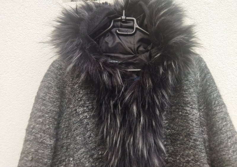 Ciepła kurtka z grubej wełnianej tkaniny dzianinowej o nieregularnym splocie w melanżowym szarym kolorze z domieszką poliestru, obszyta sztucznym futerkiem z długim włosem. Z kapturem , z raglanowymi rękawami, z dwiema wpuszczanymi kieszeniami, rozkloszowana dołem . Zapinana na dwa guziki. Całość na podszewce.