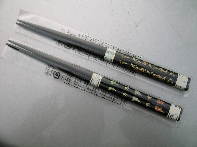 Dwa zestawy zupełnie nowych pałeczek do sushi. Na opakowaniu - Made in Japan - jedyne co potrafię odczytać :) Malowane,na błyszcząco wykończone. W oryginalnych opakowaniach. Ciekawe i oryginalne ;)