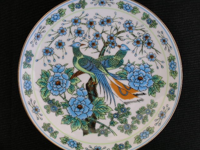 Porcelanowy talerz z graficznym ogrodowo-kwiatowo-ptasim zdobieniem w ciekawej kolorystyce. Biała porcelana, złocenie rantu. Precyzja nadruku. Sygnowany. 16 x 2 cm. Stan zachowania bardzo dobry.