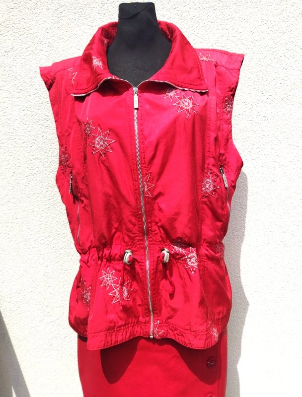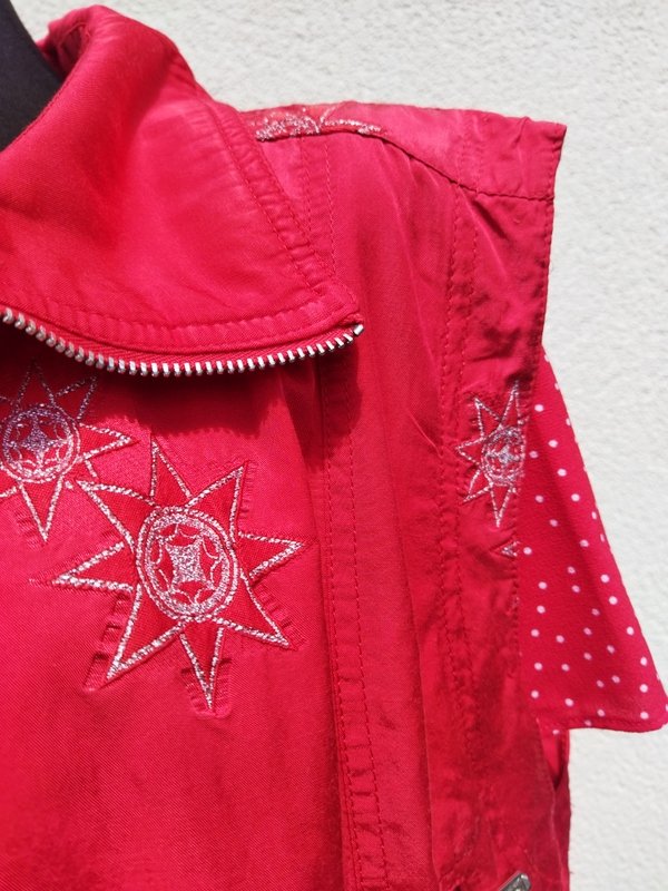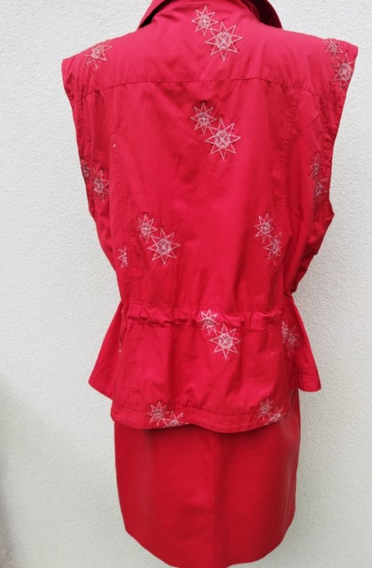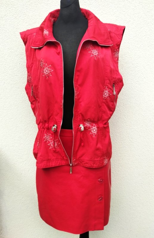 Kamizelka z wytrzymałej bawełniano-poliamidowej tkaniny w kolorze czerwieni z gwiazdkami haftowanymi metaliczną srebrną nitką . Zapinana na zamek z dwiema wpuszczanymi kieszeniami z zamkami. Ściągana w talii sznurkiem ze stoperami. Na podszewce.