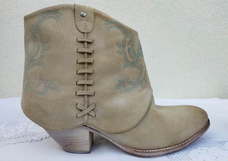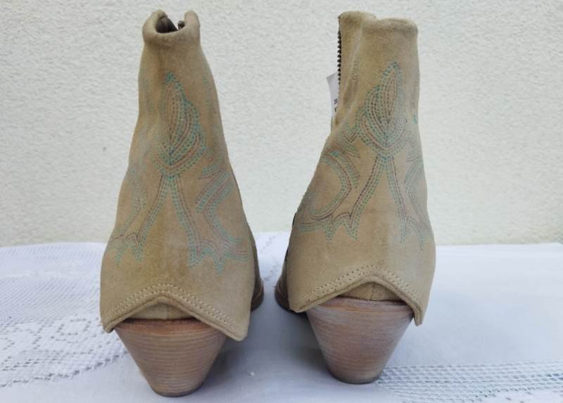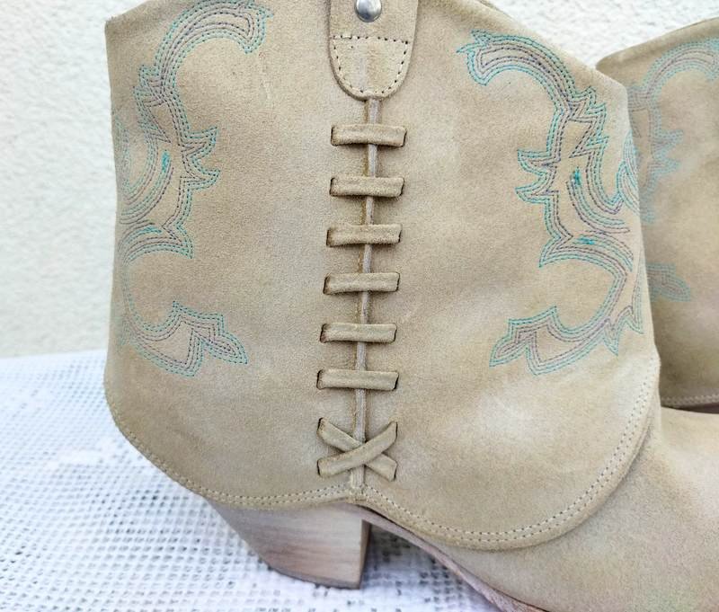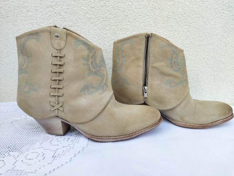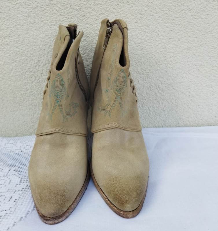 Botki a' la kowbojki z nubukowej celowo postarzanej skóry naturalnej w jasnobeżowym kolorze z dyskretnym hafcikiem w kolorach turkusu i beżu. Zapinane od wewnętrznej strony na zamek od zewnętrznej ozdobnie przeplatane. Na stabilnym obcasie. Od wewnątrz skórzana wyściółka.