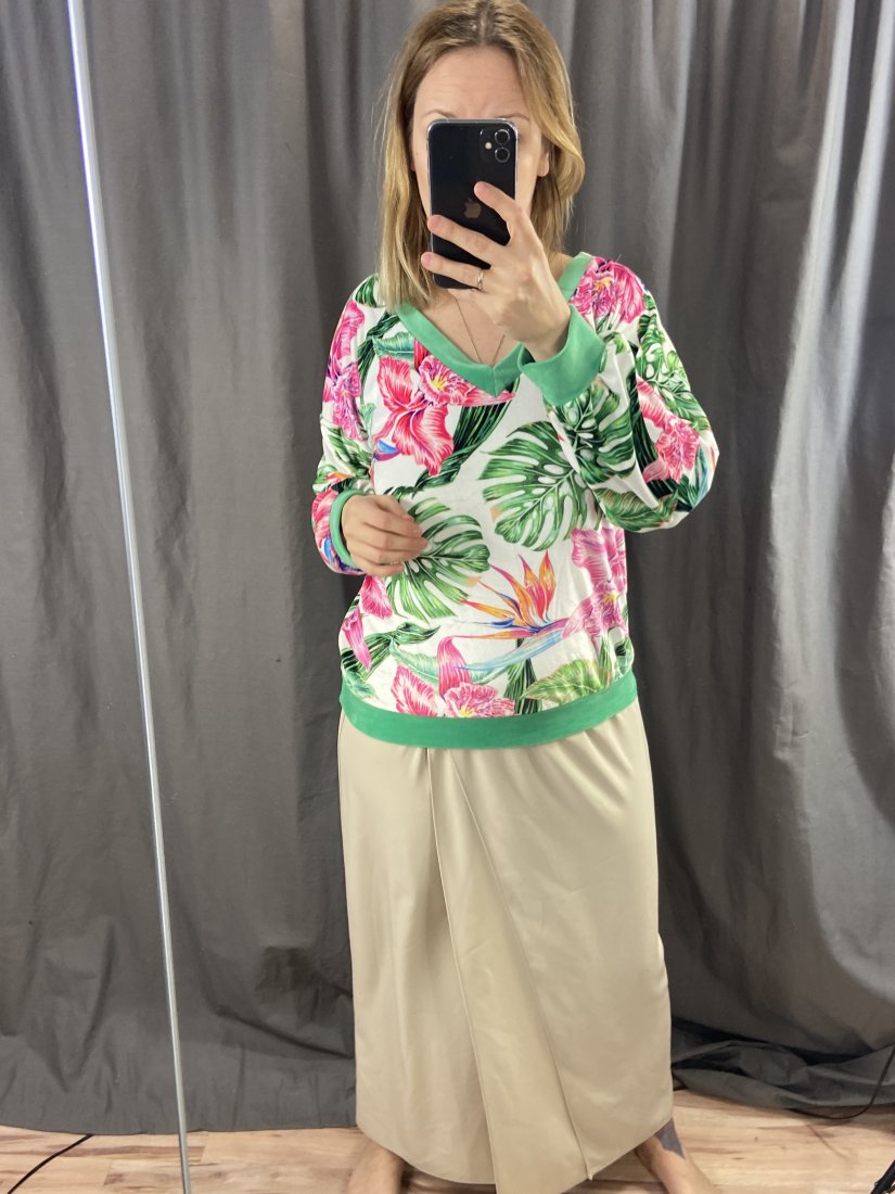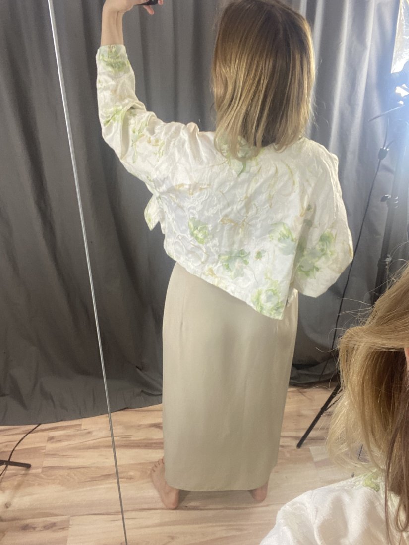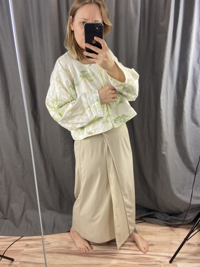 Rozmiar: 42 na metce, pasować będzie na M-XL (można sobie przezyć guziczki i dopasować idealnie do sylwetki) - bo zapinana na jest na dwa guziki w pasie na zakładkę