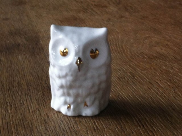 Porcelanowa figurka sowia, ręcznie złoceniem malowana, ryflowana, sygnowana Peter Gosling. Elegancka, symboliczna, do kolekcji i na prezent :) 4 x 3,5 x 6 cm. Stan zachowania bardzo dobry.