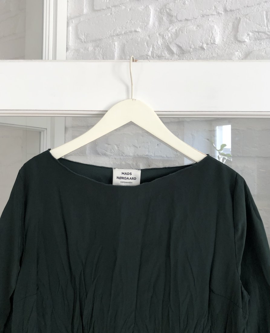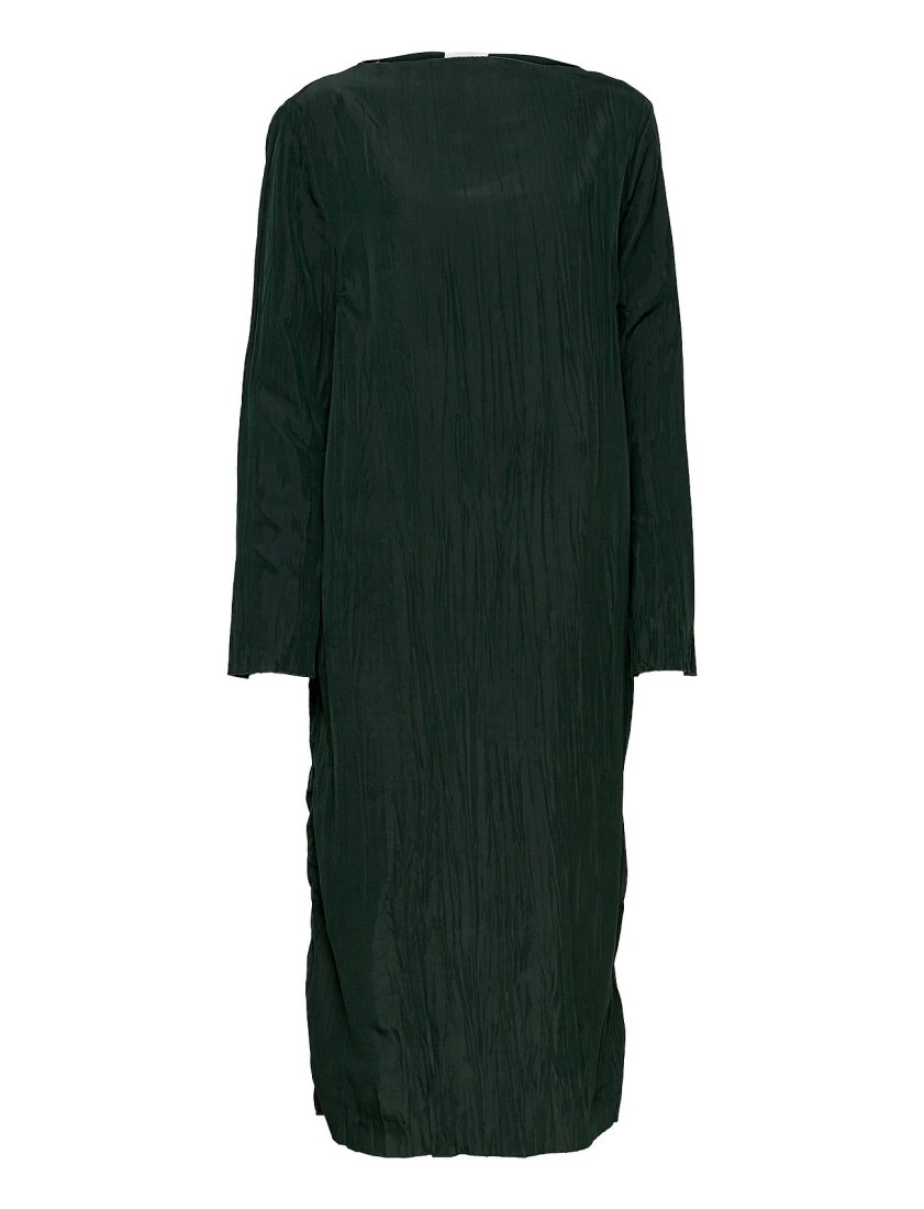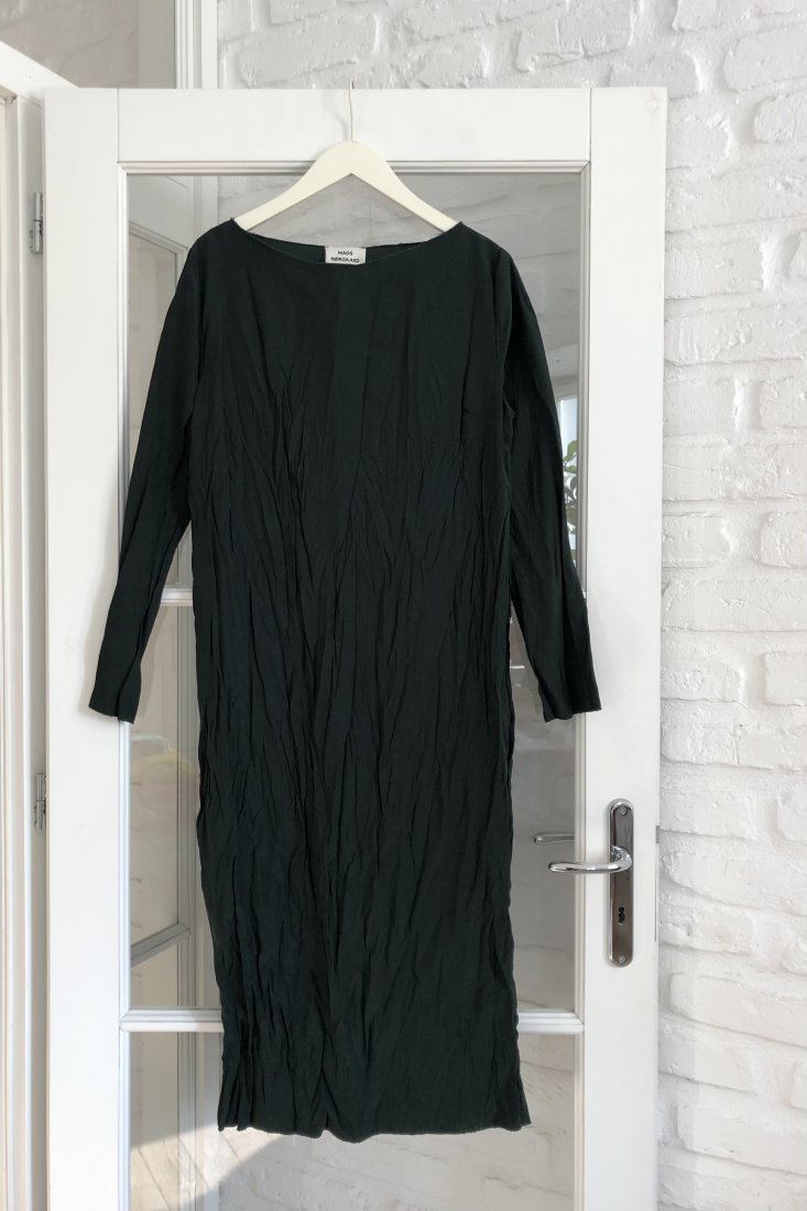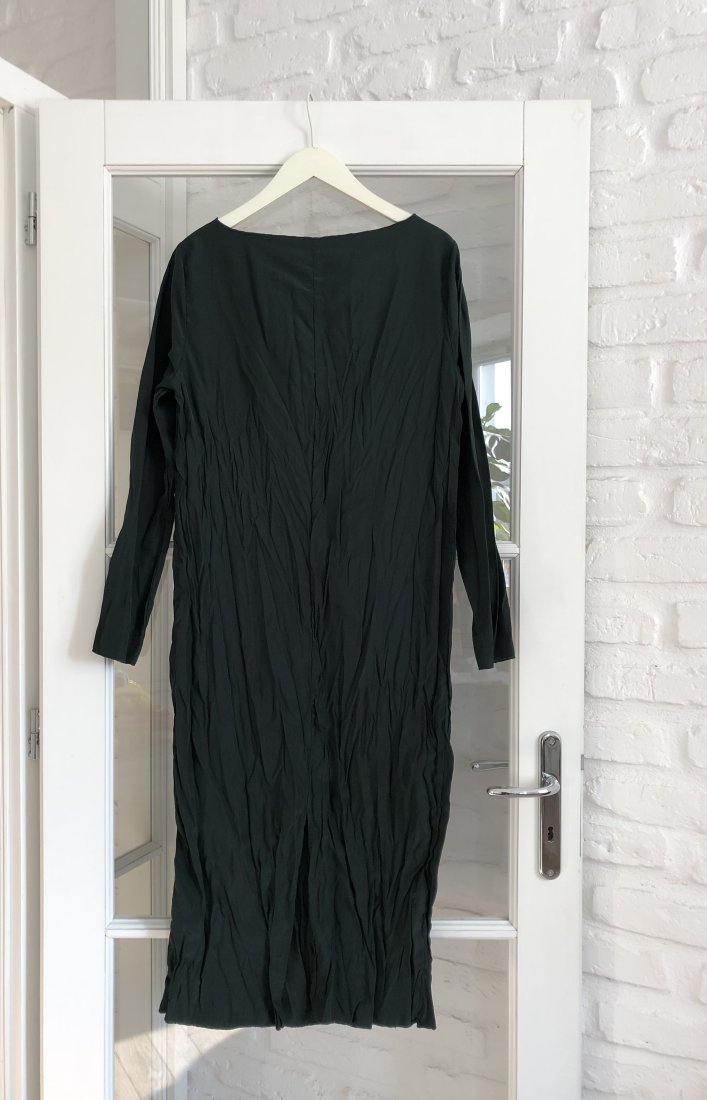 Ciemnozielona karbowana / plisowana midi sukienka o luźniejszym fasonie. Rozporek z tyłu na dole.