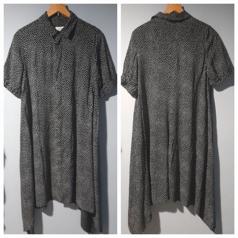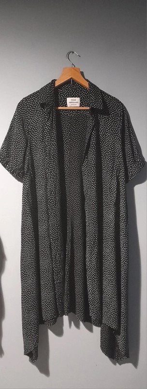 Lekka, przewiewna, klasyczna w kroju, sukienka duńskiej marki premium, asymetryczny dół, kryte zapięcie, wiskoza, stan idealny,jak nowa, długość 110/130,pachy 52x2, rękaw wykończony szeroką gumką, czarna w białe kropki