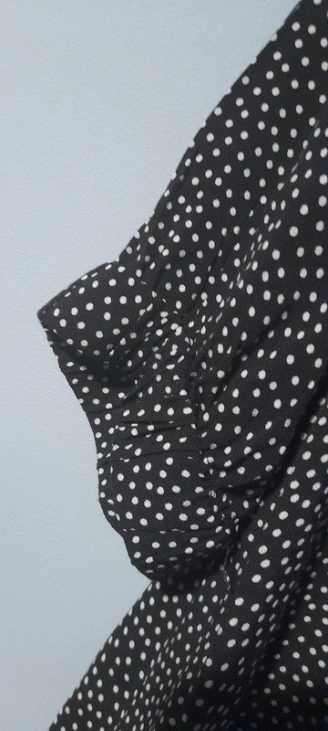 Lekka, przewiewna, klasyczna w kroju, sukienka duńskiej marki premium, asymetryczny dół, kryte zapięcie, wiskoza, stan idealny,jak nowa, długość 110/130,pachy 52x2, rękaw wykończony szeroką gumką, czarna w białe kropki