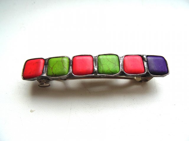 Klamra do włosów, wykonana techniką witrażowa z howlitów. Zapięcie metalowe, automatyczne. Wymiary ok. 8 na 1,3 cm.