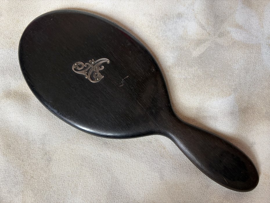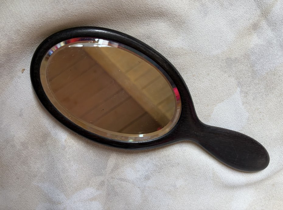 Lustereczko powiedz przecie… Szlachetne hebanowe drewno , piękne wykonanie , kryształowe lustro z fazą. Dawnej daty lustro buduarowe , zdobione pięknie wykonanym , filigranowym emblematem "A". 25 x 10 x 1 cm lustro 13 x 8 cm Stan zachowania : ślady użytkowania : drobne ryski na lustrze , widoczna na zdjęciu rysa na drewnie .