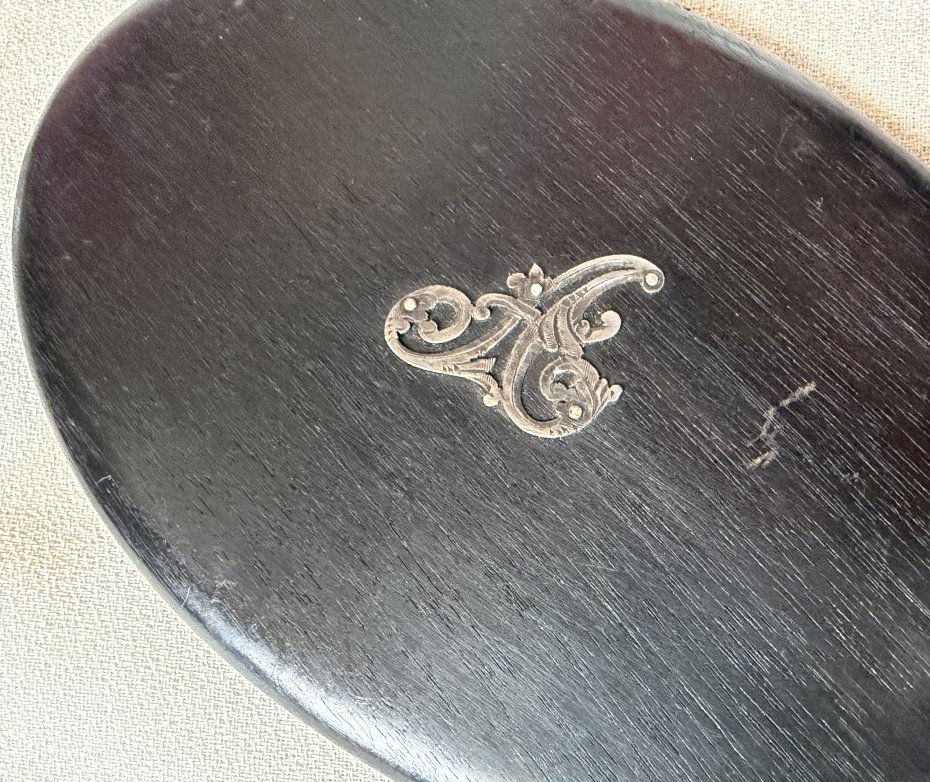 Lustereczko powiedz przecie… Szlachetne hebanowe drewno , piękne wykonanie , kryształowe lustro z fazą. Dawnej daty lustro buduarowe , zdobione pięknie wykonanym , filigranowym emblematem "A". 25 x 10 x 1 cm lustro 13 x 8 cm Stan zachowania : ślady użytkowania : drobne ryski na lustrze , widoczna na zdjęciu rysa na drewnie .