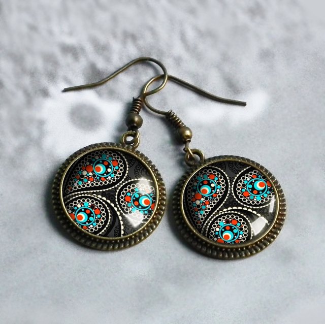 Kolczyki z autorską grafiką, zatopioną pod wypukłym szkiełkiem ( tzw. szklanym kaboszonem dającym delikatny efekt trójwymiarowości) i oprawioną w hipoalergiczną bazę w kolorze antycznego złotego brązu. Grafika jest najwyższej jakości, bardzo wyraźna i nasycona. Bigle antyalergiczne w kolorze antycznego złotego brązu ( do bigli dołączone są silikonowe stopery zapobiegające zgubieniu kolczyka).
