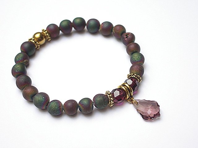 Bransoletka wykonana z naturalnych agaty pokryte tytanem i gdzieniegdzie z widocznymi druzami [8mm], hematytu [8mm], fasetowanych kryształków [8mm] zawieszki z kryształkiem Swarovskiego [Baroque] oraz elementów w kolorze złota. Bransoletka na gumce silikonowej. Pasuje na nadgarstek 16-17cm. Biżuteria ozdobnie zapakowana. Możliwość dopasowania bransoletki do nadgarstka - wcześniej prosimy o kontakt.