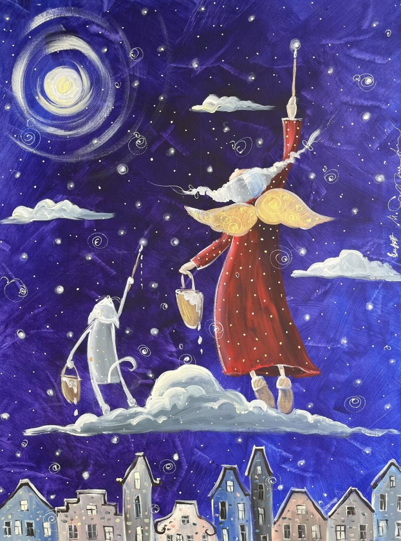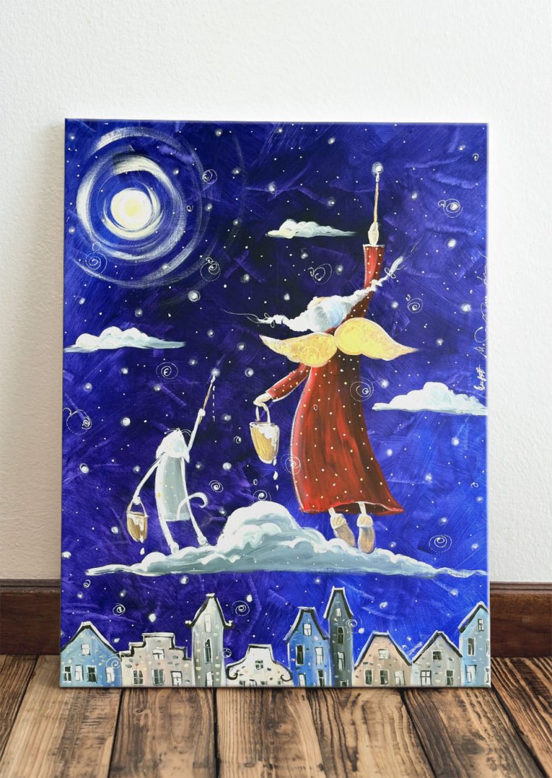 Autorski obraz malowany ręcznie farbami akrylowymi, a następnie wydrukowany na wysokiej jakości płótnie i naciągnięty na drewniane krosno. Obraz nosi tytuł "Magiczne gwiazdki marzeń".