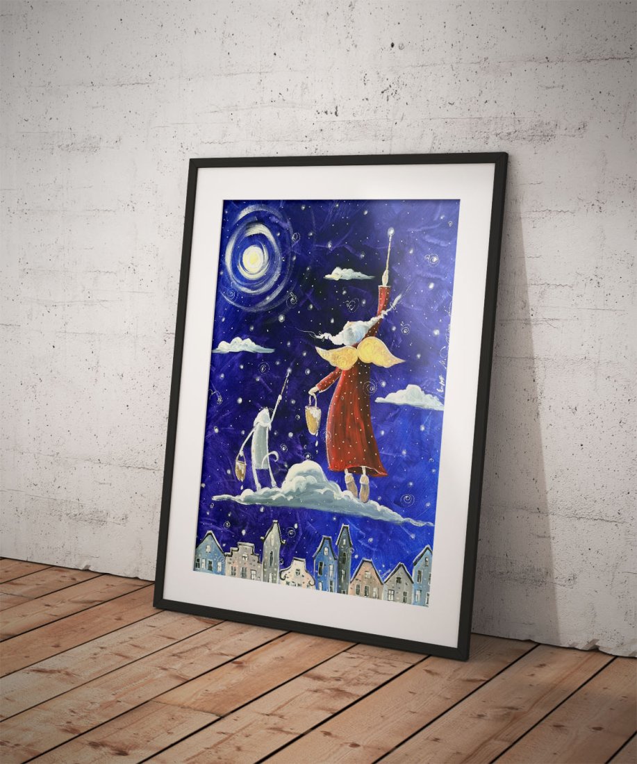 Reprodukcja własnej pracy o tytule "Magiczne gwiazdki marzeń", malowanej oryginalnie farbami akrylowymi na płótnie. Drukowana za pomocą ekologicznych, bezwonnych tuszy pigmentowych EPSON UltraChrome HD Ink, na białym papierze o gramaturze 200-220 g/m². Ostatnie zdjęcie przedstawia wydruk w formacie A4 oprawiony w drewnianą ramę z białym passe-partout. Wymiary zewnętrzne ramy to 30x40 cm, natomiast listwa mierzy 1,5x1,5 cm i pomalowana jest na ciemnoszary kolor.