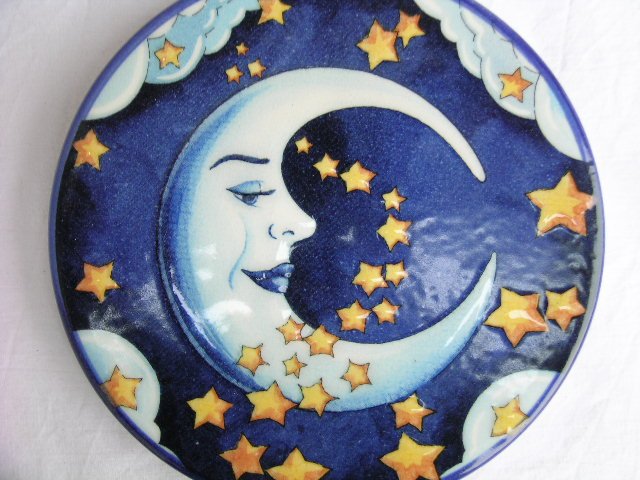 Piękną obecnością Księżyca zdobiony, głębokimi barwami nocy wypełniony talerz-obrazek do powieszenia. Ceramiczny, na błyszcząco szkliwiony. W pokoju Dziecka zapewni opiekę i rozbudzi wyobraźnię :) Wyjątkowy, bo jak z malowanego snu. 17 x 2 cm. Stan zachowania bardzo dobry.