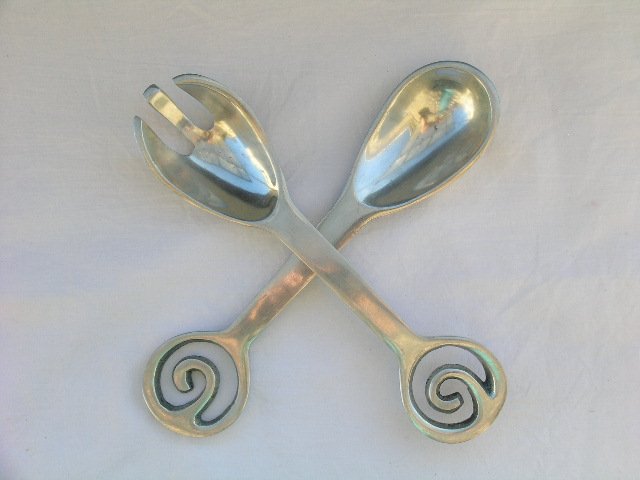 Oryginalne, ciekawe sztućce sałatkowe z lekkiego stopu metalowego. Błyszczące, symbolicznie zdobione. Nowoczesne, z artystycznym polotem. Ozdoba stołu, praktyczne i intrygujące. 22 x 5,5 x 3 cm. Stan zachowania bardzo dobry.