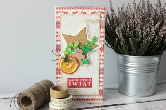 Przestrzenna, pachnąca cynamonem kartka świąteczna. Wykonana na białej bazie w formacie DL, ozdobiona suszoną pomarańczą, papierowym pierniczkiem,przeszyciami oraz kryształkami. Brzegi postarzone zostały brązowym tuszem.