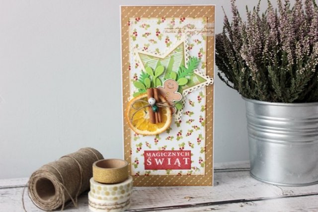 Przestrzenna, pachnąca cynamonem kartka świąteczna. Wykonana na białej bazie w formacie DL, ozdobiona suszoną pomarańczą, papierowym pierniczkiem,przeszyciami oraz kryształkami. Brzegi postarzone zostały brązowym tuszem.