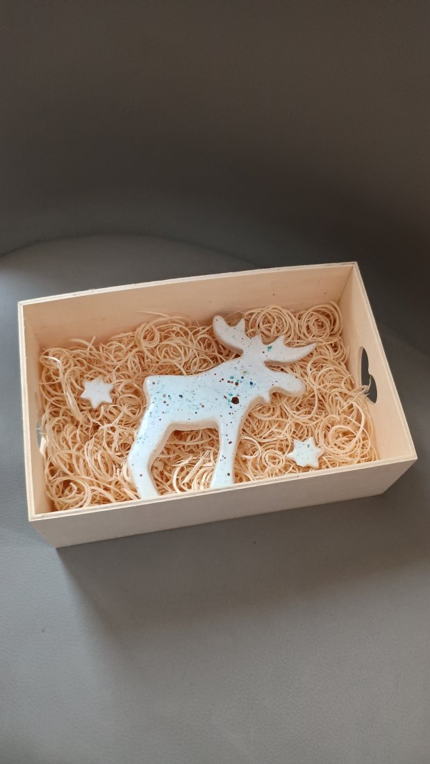 Wykonany w pracowni ceramicznej. Duży magnes w kształcie łosia i dwa małe w kształcie gwiazdek. Zestaw.