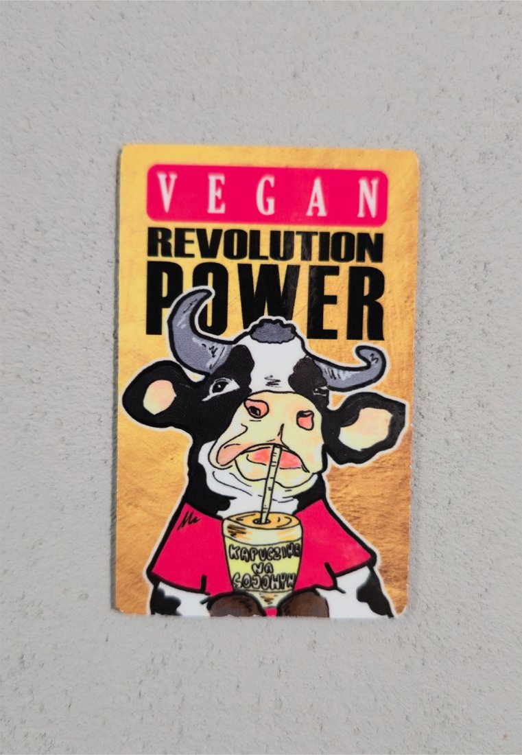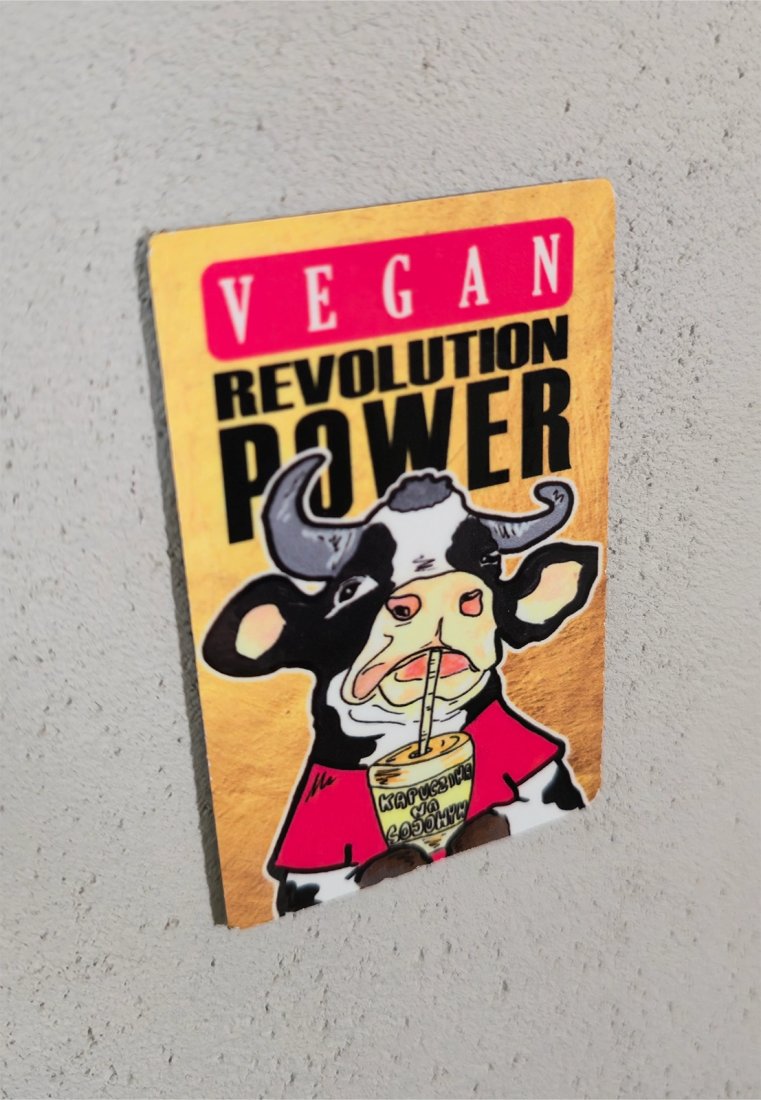 Magnes na lodówkę z motywem wegańskiej krowy.