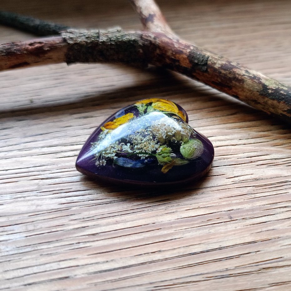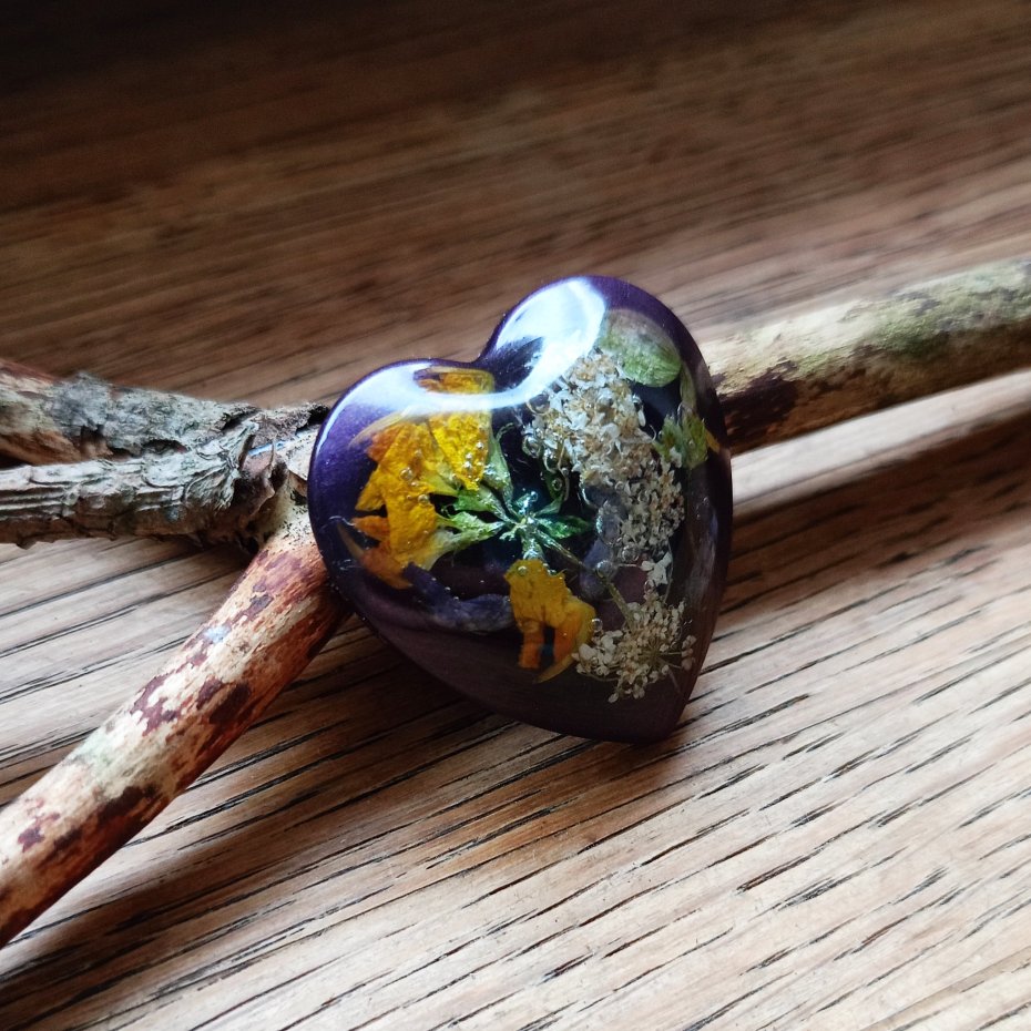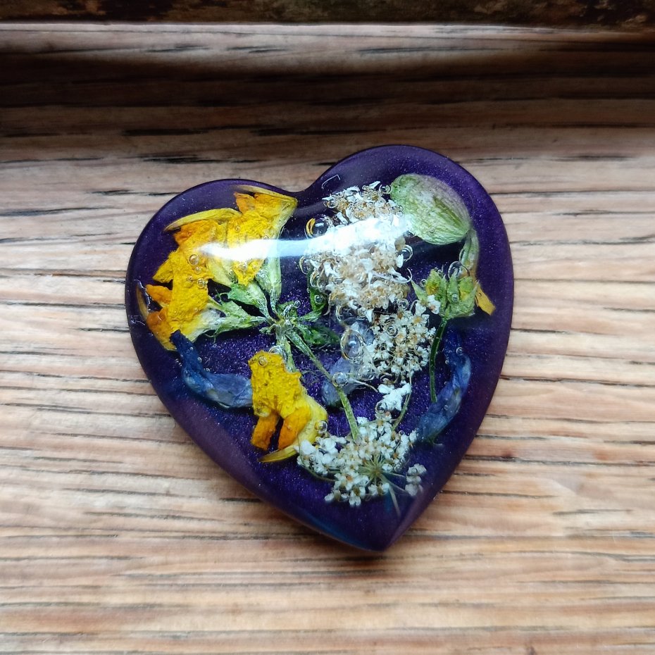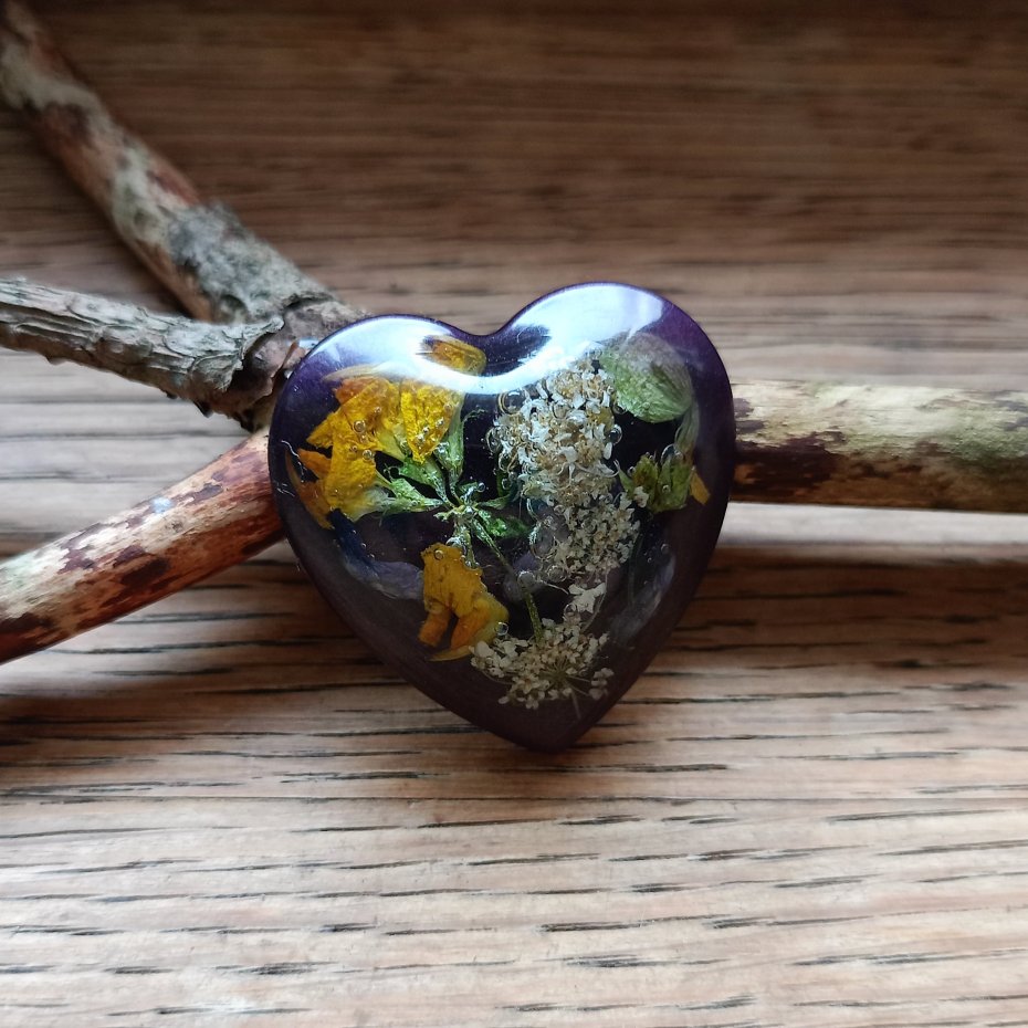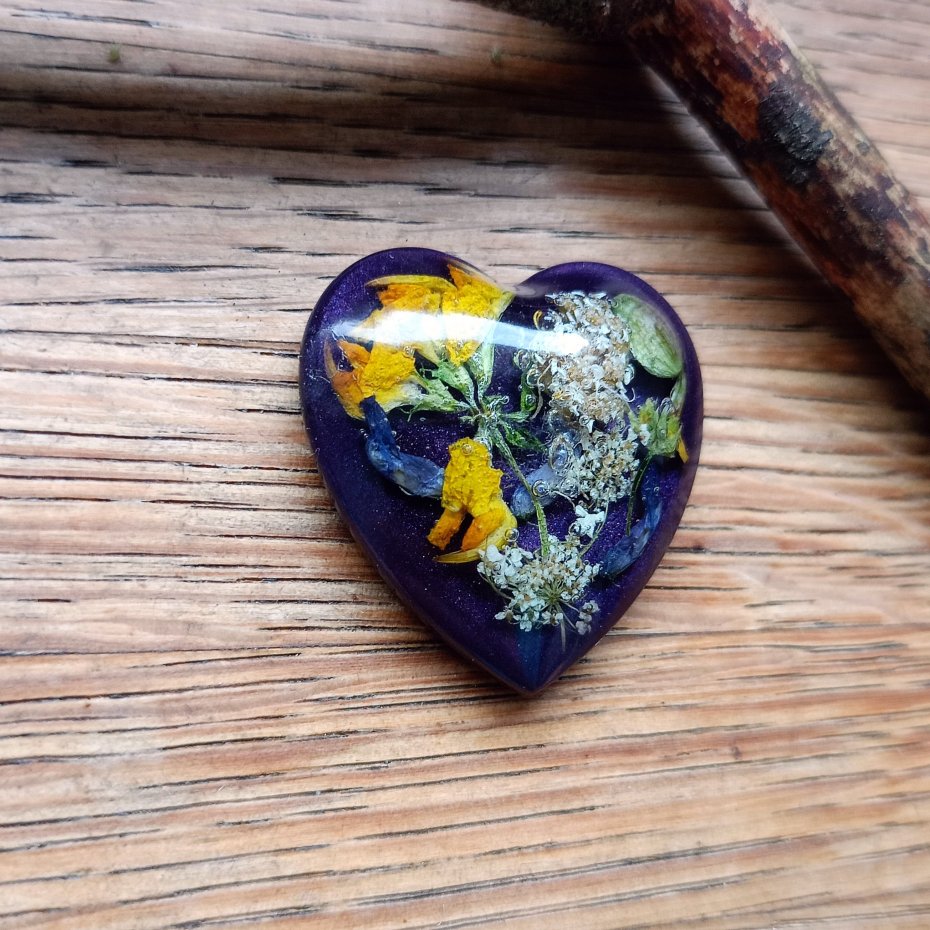 Magnes ręcznie wykonany z żywicy epoksydowej, z zatopionymi prawdziwymi, suszonymi kwiatami.