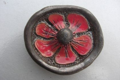 Ceramiczny, ręcznie formowany magnesik na lodówkę. Rzeźbiony wzór kwiatowy. Okrągły przestrzenny koralik na druciku, przewleczony przez dziurkę. Metaliczne szkliwo złote i soczysta czerwień. 5,5 x 4,5 x 1 cm. Autorski. Unikatowy.