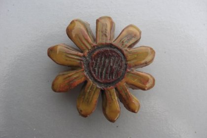 Ceramiczny, ręcznie formowany magnesik na lodówkę. Rzeźbiony wzór kwiatowy. Brąz, żółty i szczypta pomarańczu. 4 x 1 cm. Autorski. Unikatowy.