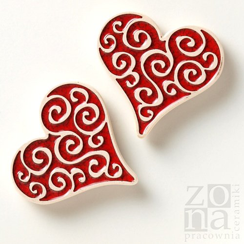 Dwa ceramiczne, ornamentowe magnesy serca, od serca. Wykonane z jasnej gliny, pokryte błyszczącym, intensywnie czerwonym szkliwem. Dwukrotnie wypalane w wysokiej temperaturze. Od spodu naklejony okrągły, bardzo silny magnes. Na zamówienie istnieje możliwość wykonania większej ilości podobnych. Wymiary 1 magnesu serca: wysokość 6 cm, szerokość 6,5 cm, grubość 0,6 cm + grubość magnesu 0,3 cm. Cena obejmuje 2 magnesy serca. Polecam serdecznie.