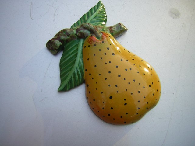 Duży magnes na lodówkę. Ogromna gruszka ręcznie malowana. Bardzo efektowna. Fakturowa, kolorowa na błyszcząco lakierowana . Z lekkiej masy, pusta w środku, przestrzenna .6,5 x 10 x 1,5 cm