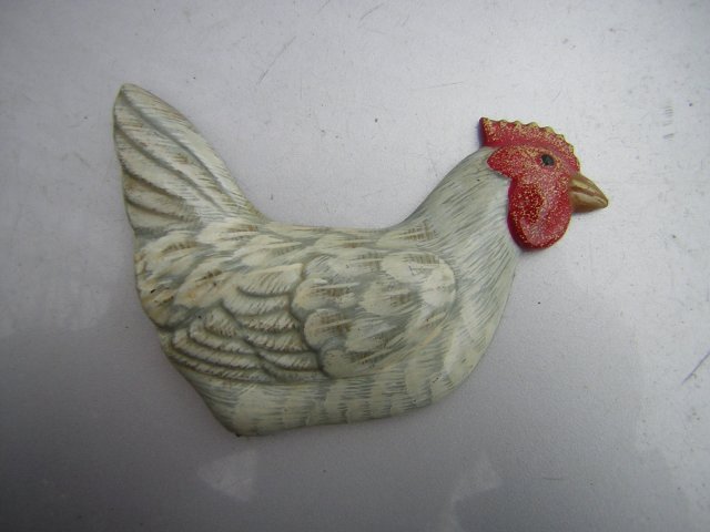 Magnetyczna Kura - Magnes ręcznie precyzyjnie pędzelkiem malowany, na błyszcząco lakierowany. Z lekkiej masy. Na lodówkę, tablicę... dla uśmiechu. 9,5 x 7,5 x 1 cm. Stan zachowania bardzo dobry.