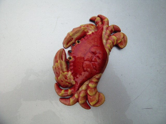 Magnetyczny Duży KRAB - Magnes ręcznie precyzyjnie pędzelkiem malowany, na błyszcząco lakierowany. Z lekkiej masy. Na lodówkę, tablicę... dla uśmiechu. 9 x 6 x 1 cm. Stan zachowania bardzo dobry. od zewnętrznej strony; Magnes jest pęknięty,ale działa bez zarzutu.