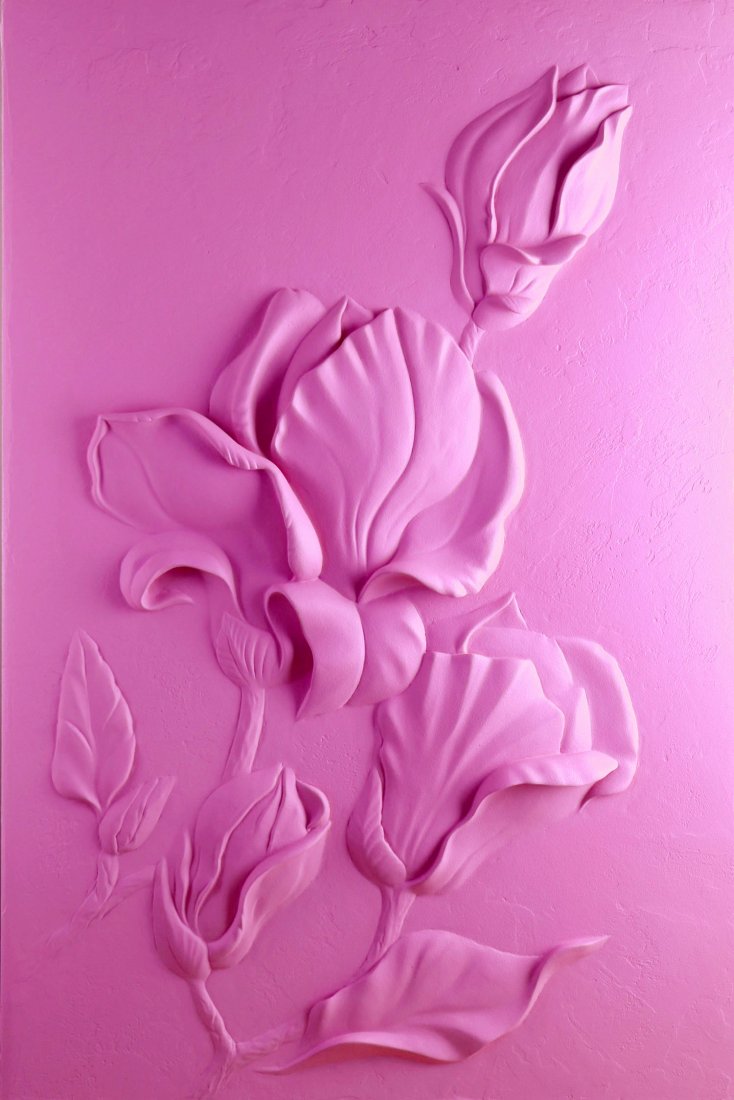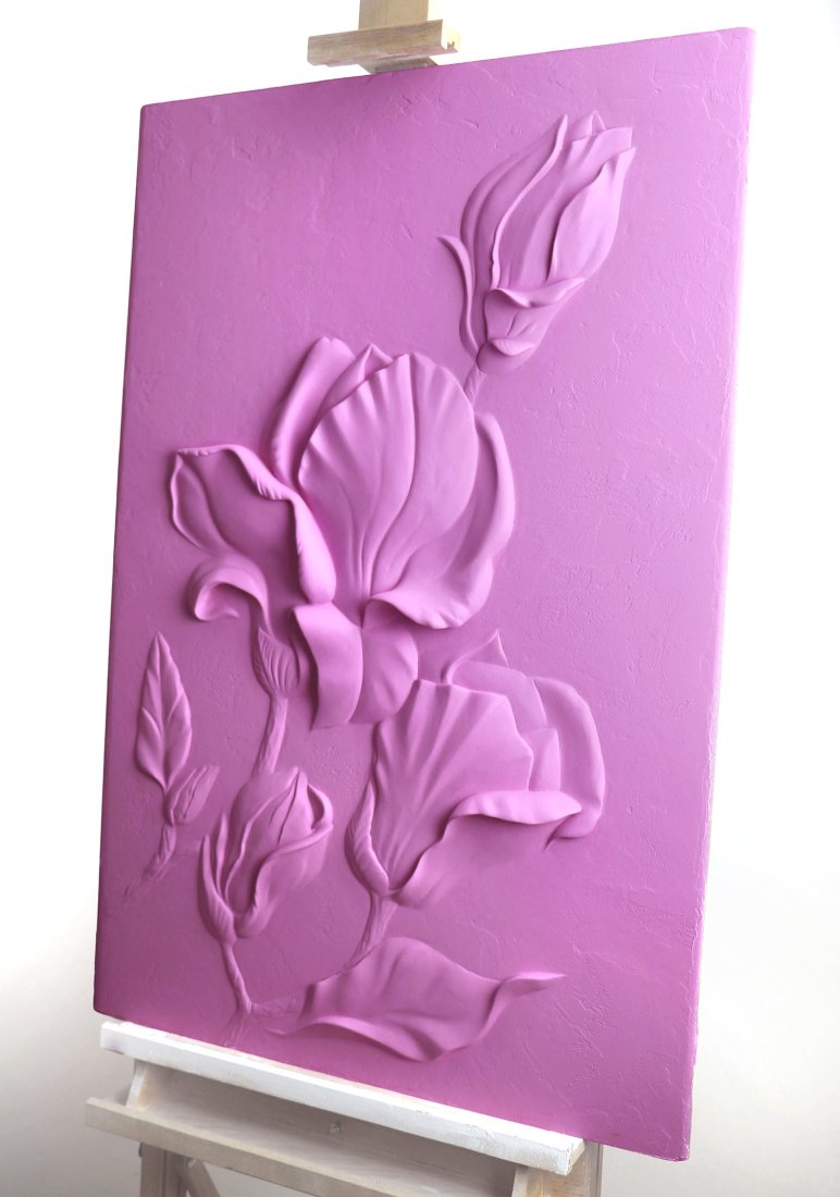 Zwykle tworzę białe płaskorzeźby, ale zimą – gdy światła i kolorów jest znacznie mniej, zdecydowałam się dodać do wnętrza dawkę kolorystyczną i odrobinę energii. Dlatego powstał nowy, intensywnie magentowy obraz "Magnolia".